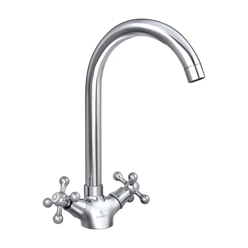 Современный двухрычажный смеситель для кухни с высоким поворотным изливом от компании «СЛАВЕН» c собственной сборочной линией полного цикла в Подмосковье.