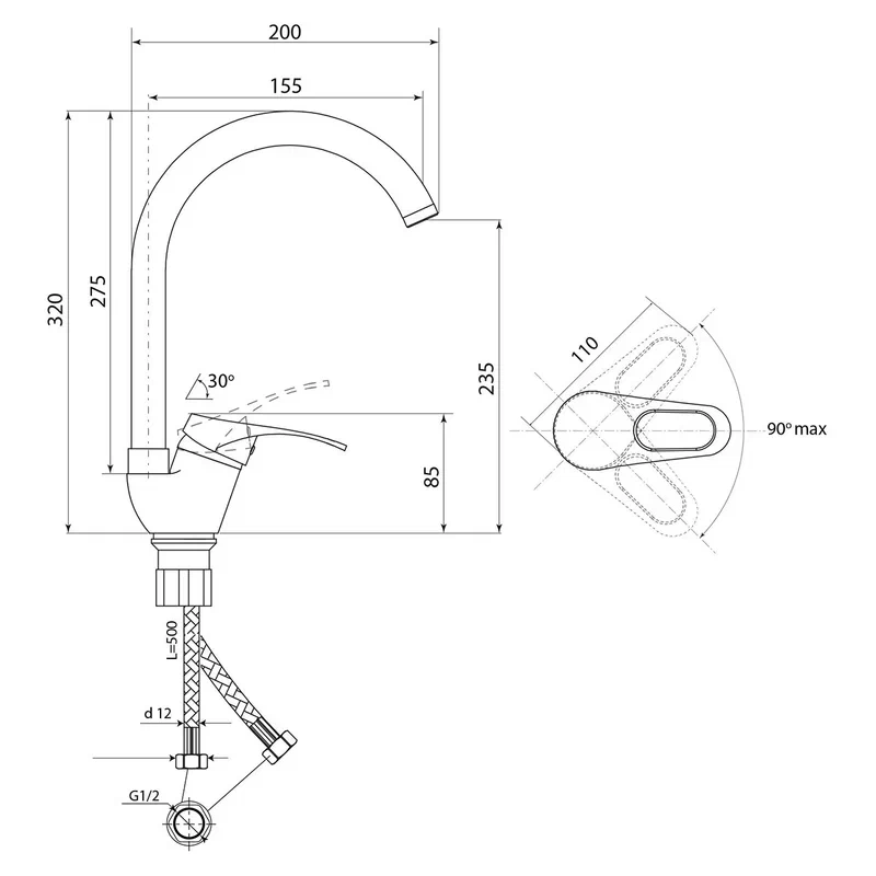 Тип подводки для воды: Подводка гибкая в нейлоновой оплетке, длина 500 мм;