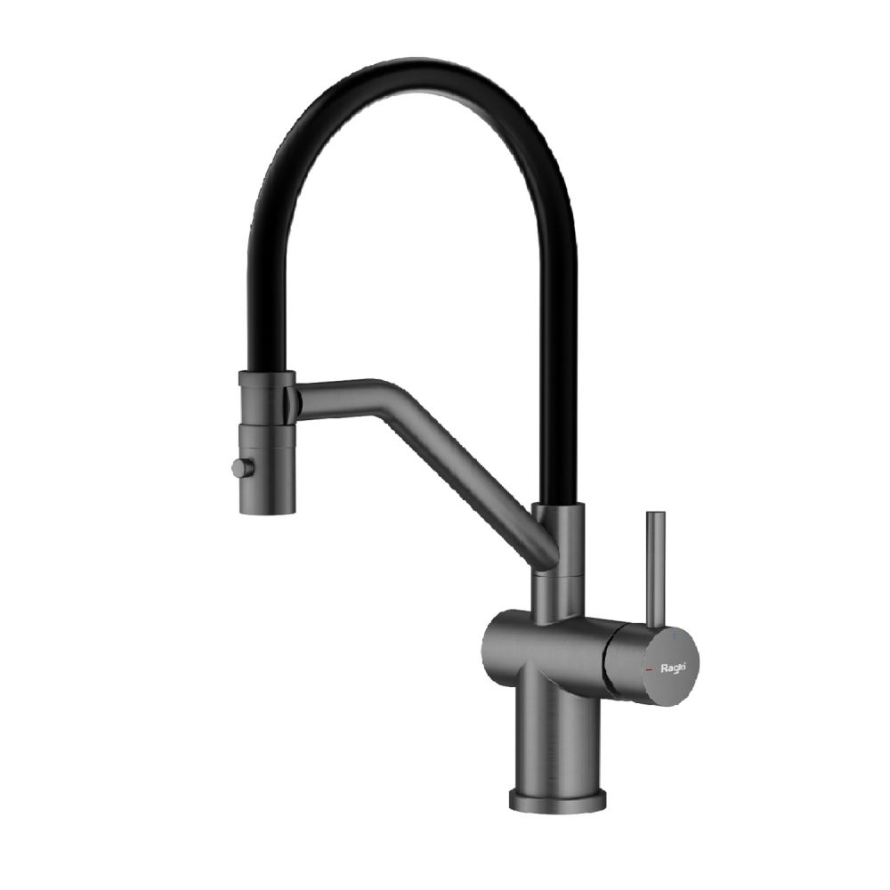 Raglo R86.41.09. Цвет: графит. Смеситель для кухни со съемным изливом на магните. Кухонные смесители торговой марки RAGLO – это оригинальность и уют для каждого дома. Кран выполнен из высококачественных материалов, что гарантирует его долговечность и надежность. Эта сантехника отличается полезным функционалом, экологичными решениями, оригинальным стилем и легкостью монтажа. Поворотный излив позволяет с большим удобством пользоваться им на кухне. Оснащен гибкой системой подключения, что облегчает его монтаж и установку. Встроенный аэратор эффективно фильтрует примеси и уменьшает шум от импульсов воды. Гладкая внутренняя стенка обеспечивает мягкий поток воды. Подходит к кухонным мойкам практически любых размеров и форм. Кухонный смеситель является неотъемлемой частью любой кухни, и данный смеситель - отличный выбор для тех, кто ценит качество, надежность и комфорт.