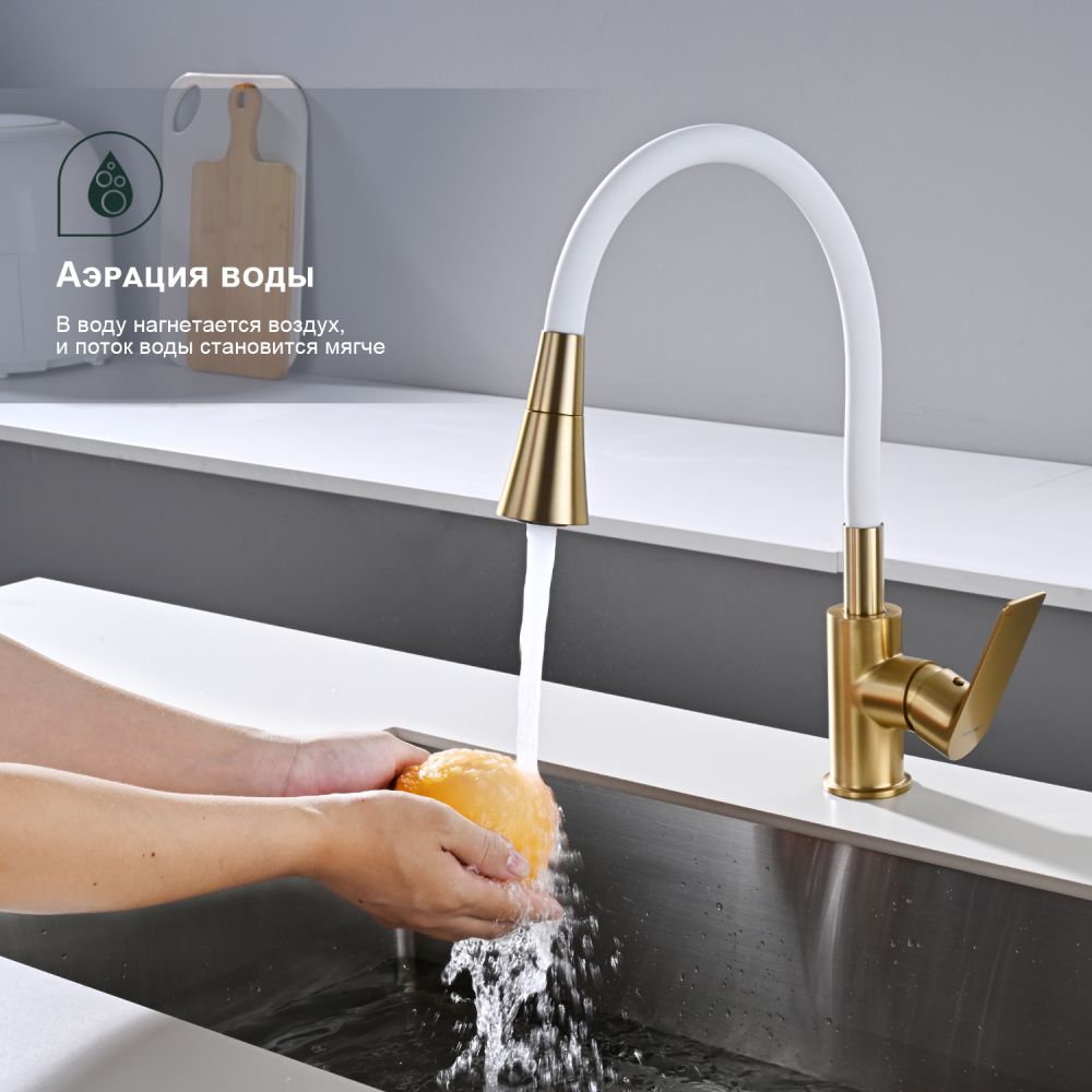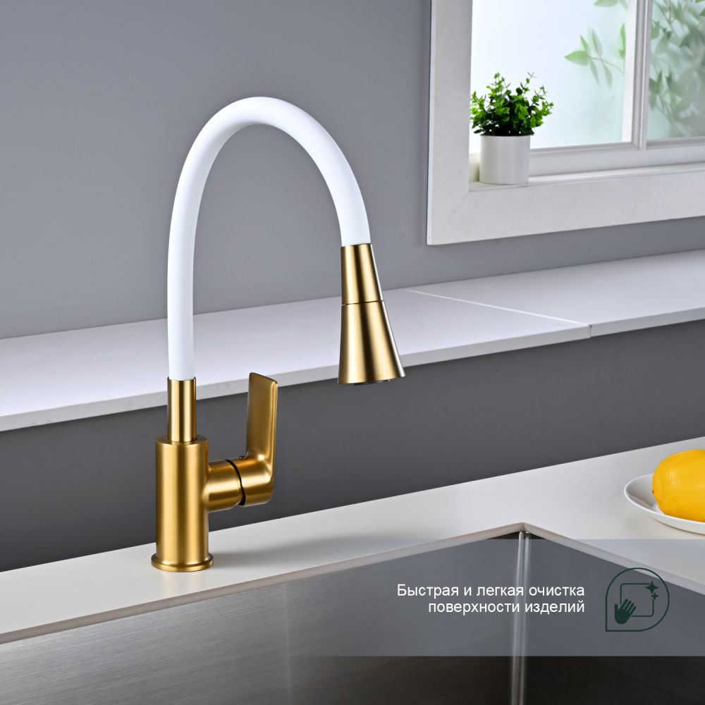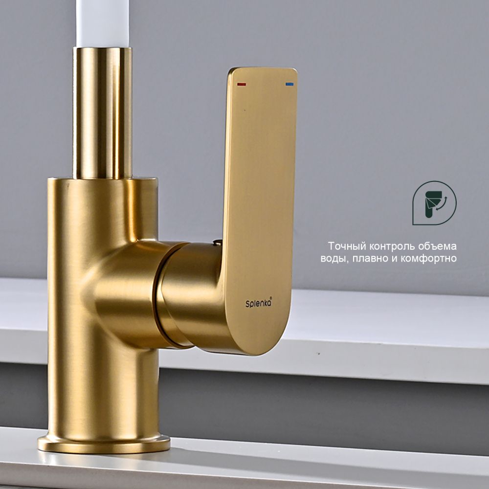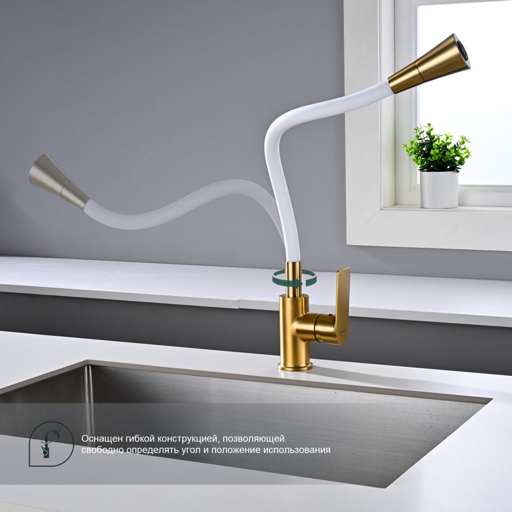 Смеситель для кухни Splenka S05.43.03 идеально подходит для кухонной мойки, раковины любого типа. Цвет: сатин золотой. Смеситель имеет 2 режима: поток воды и душ. Кран с гибким изливом имеет необычный внешний вид и особую конструкцию. С помощью гибкого шланга можно самостоятельно регулировать глубину выноса и высоту излива, что позволит избежать лишнего разбрызгивания воды. Также с помощью силиконового излива не составит труда добраться до всех мест в мойке, что упрощает мытье посуды и продуктов. Стильный латунный смеситель имеет свойство шумоподавления.