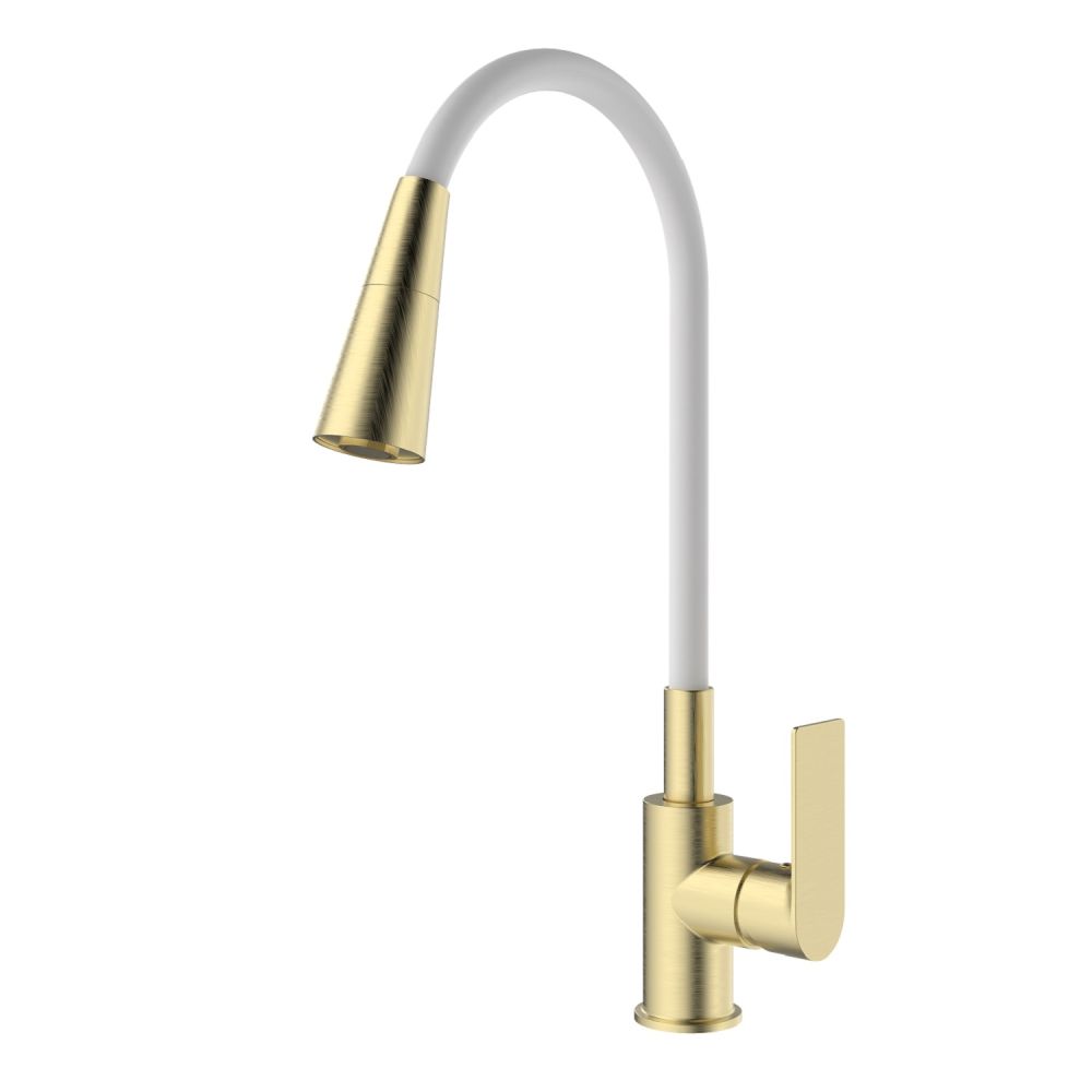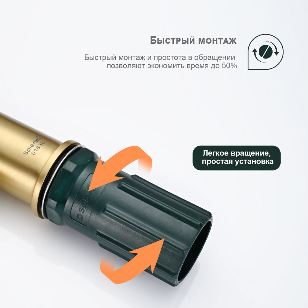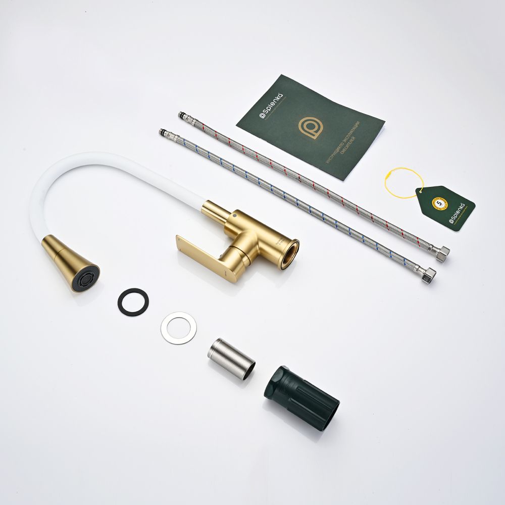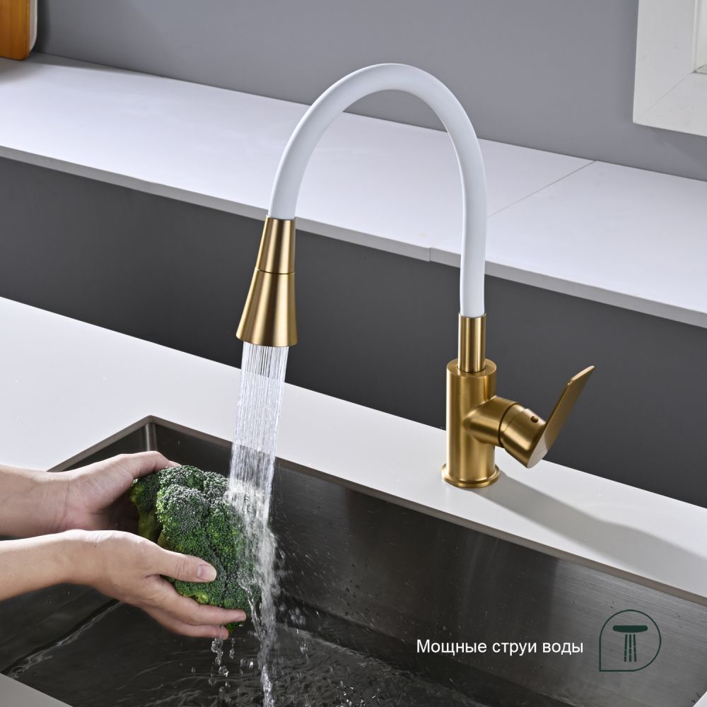 Смеситель для кухни Splenka S05.43.03 идеально подходит для кухонной мойки, раковины любого типа. Цвет: сатин золотой. Смеситель имеет 2 режима: поток воды и душ. Кран с гибким изливом имеет необычный внешний вид и особую конструкцию. С помощью гибкого шланга можно самостоятельно регулировать глубину выноса и высоту излива, что позволит избежать лишнего разбрызгивания воды. Также с помощью силиконового излива не составит труда добраться до всех мест в мойке, что упрощает мытье посуды и продуктов. Стильный латунный смеситель имеет свойство шумоподавления.