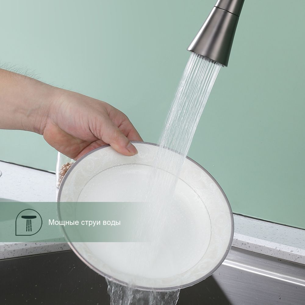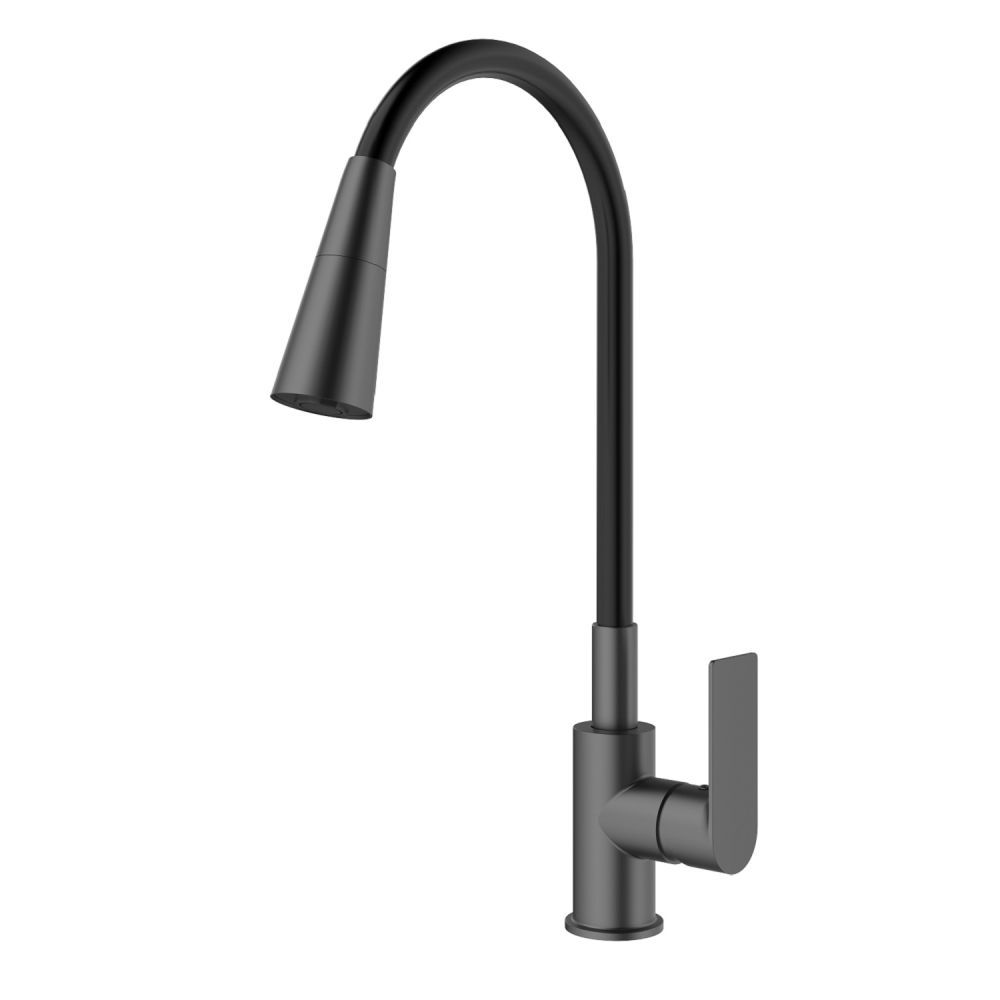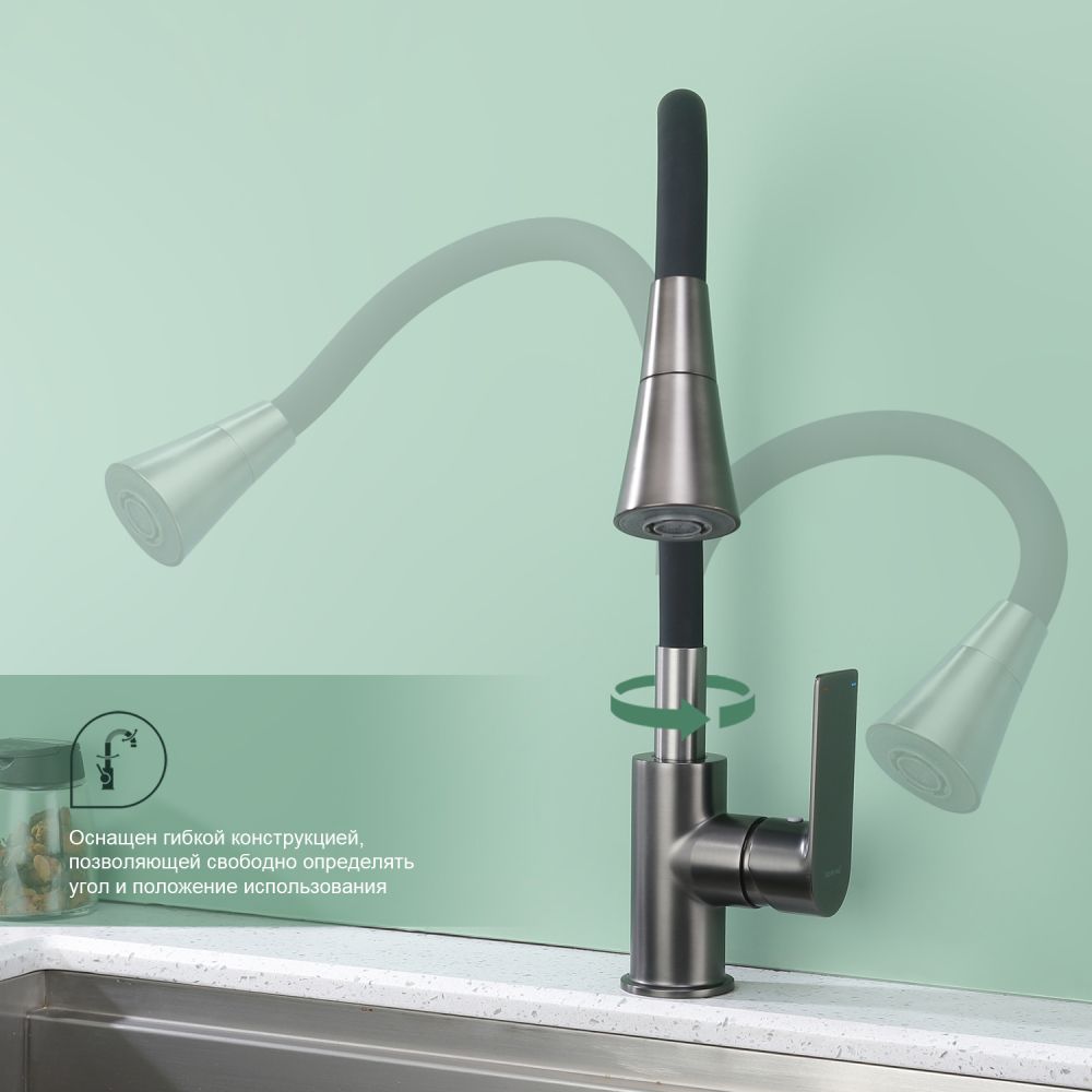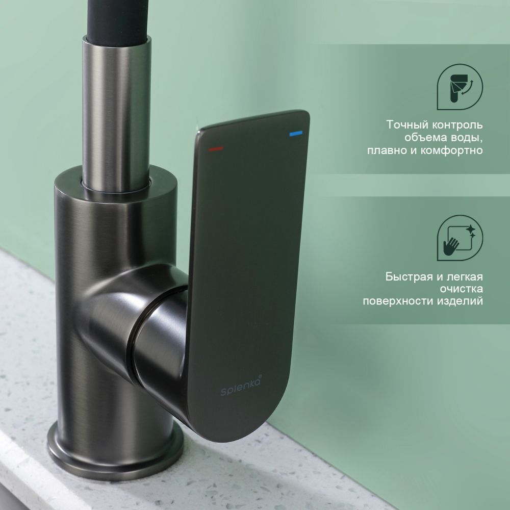 Смеситель для кухни Splenka S05.43.09 идеально подходит для кухонной мойки, раковины любого типа. Цвет: графит. Смеситель имеет 2 режима: поток воды и душ. Кран с гибким изливом имеет необычный внешний вид и особую конструкцию. С помощью гибкого шланга можно самостоятельно регулировать глубину выноса и высоту излива, что позволит избежать лишнего разбрызгивания воды. Также с помощью силиконового излива не составит труда добраться до всех мест в мойке, что упрощает мытье посуды и продуктов. Стильный латунный смеситель имеет свойство шумоподавления.