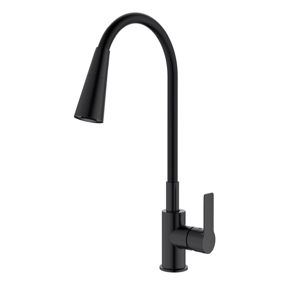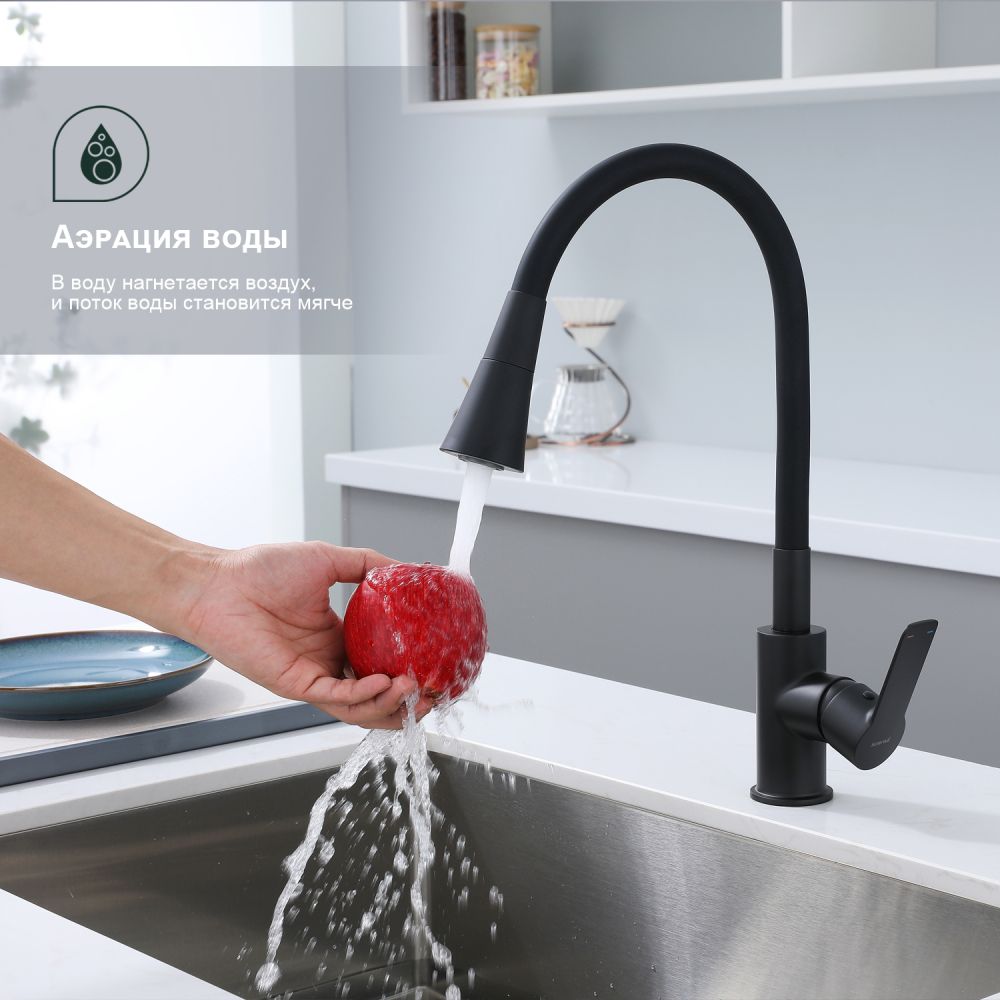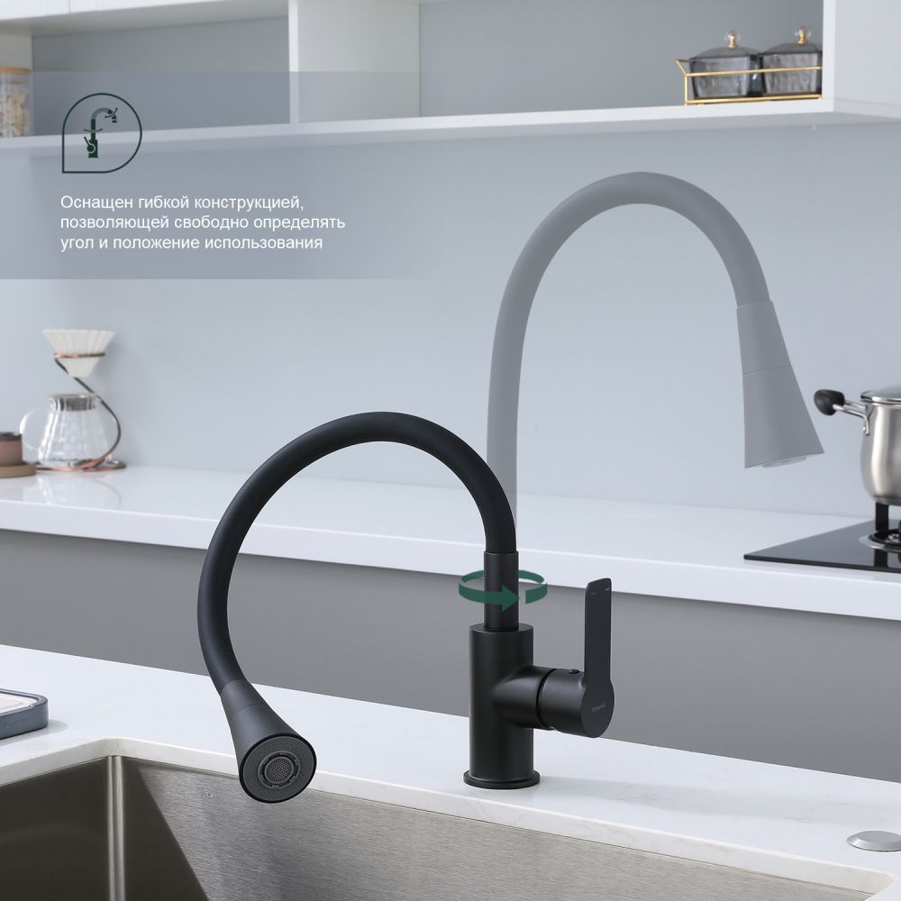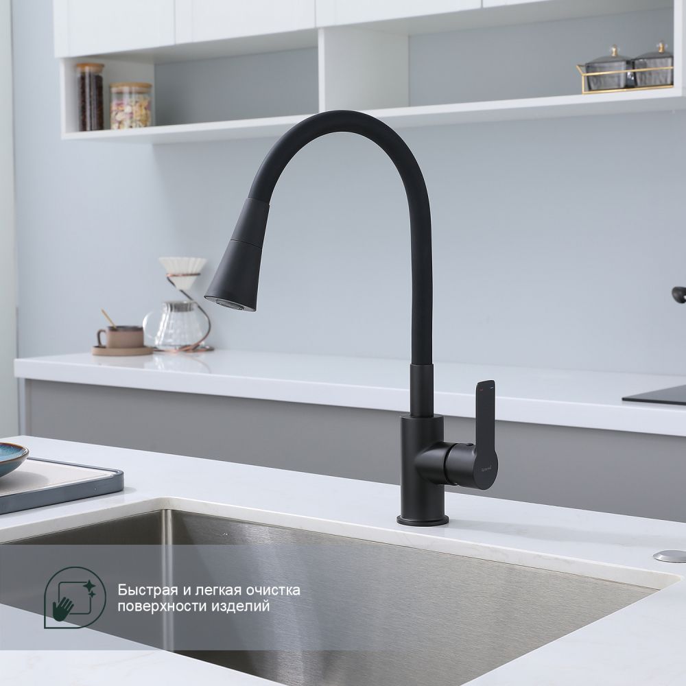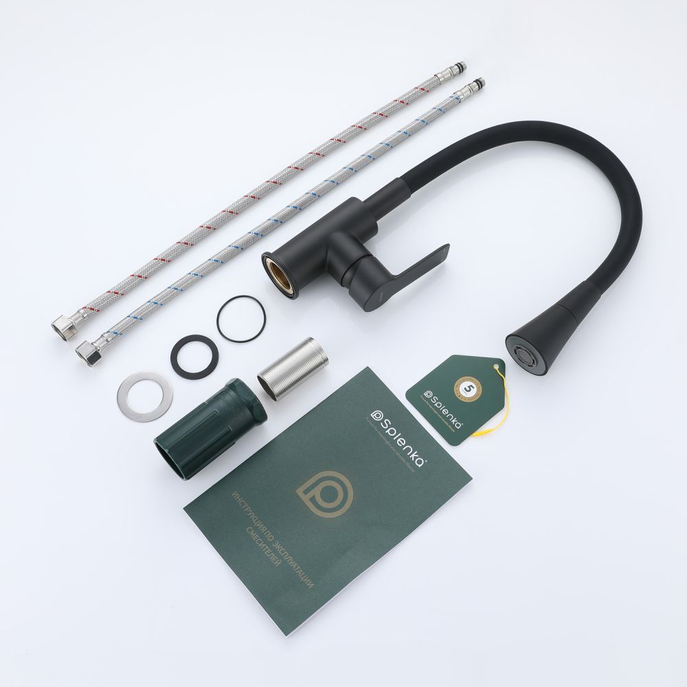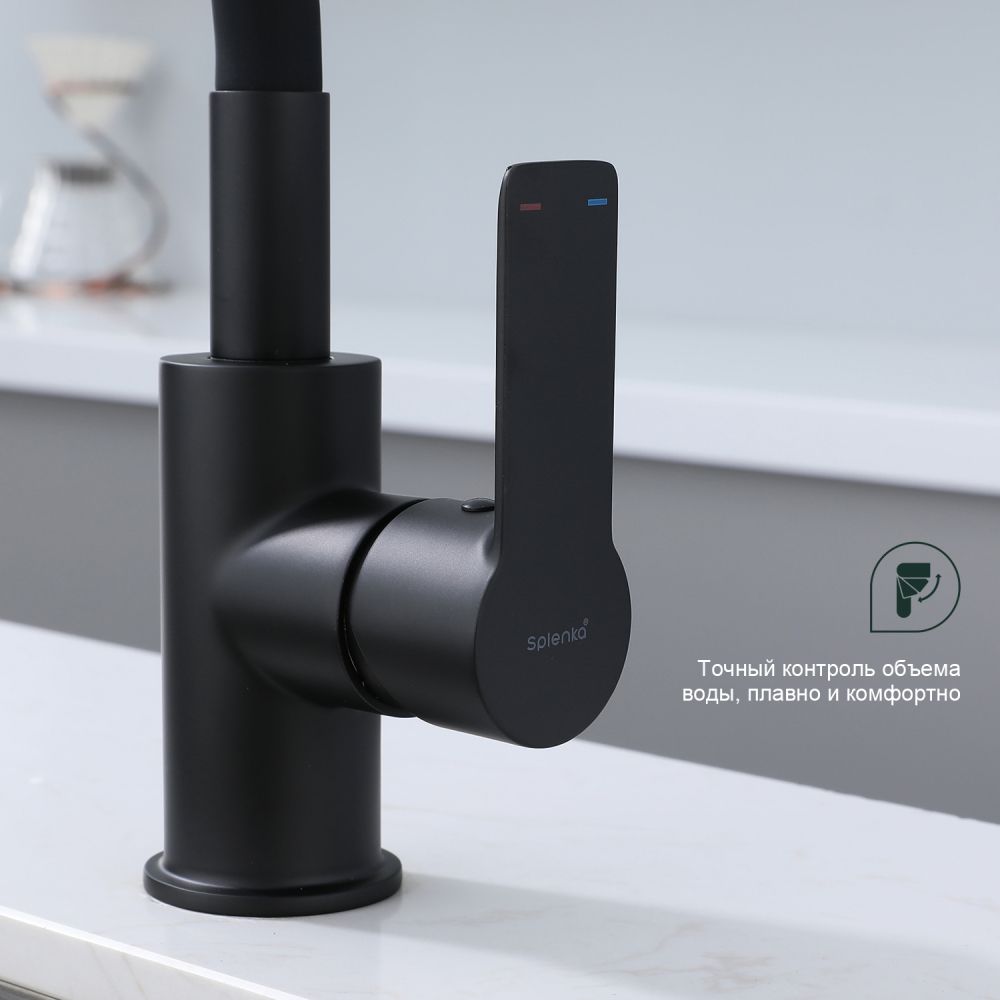 Смеситель для кухни Splenka S06.43.06 идеально подходит для кухонной мойки, раковины любого типа. Цвет: черный. Смеситель имеет 2 режима: поток воды и душ. Кран с гибким изливом имеет необычный внешний вид и особую конструкцию. С помощью гибкого шланга можно самостоятельно регулировать глубину выноса и высоту излива, что позволит избежать лишнего разбрызгивания воды. Также с помощью силиконового излива не составит труда добраться до всех мест в мойке, а также упрощает мытье посуды и продуктов. Стильный латунный смеситель имеет свойство шумоподавления.