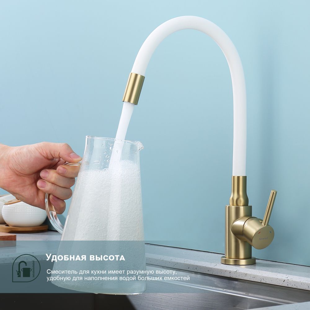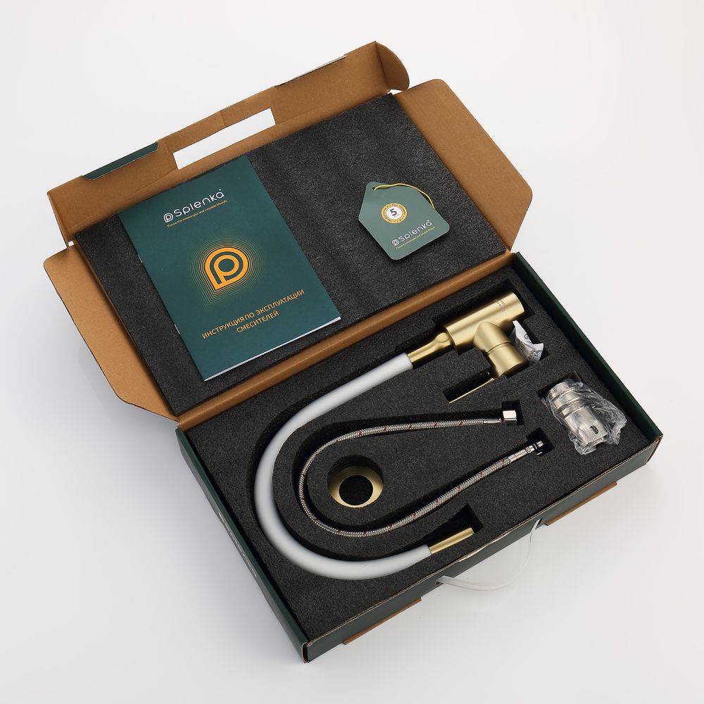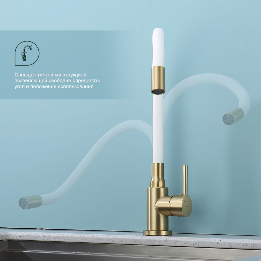 Смеситель для кухни Splenka S201.4408.03. Цвет: сатин золотой. Смеситель для кухни сочетает в себе удобную конструкцию, простоту в установке, универсальный современный дизайн и доступную цену за высокое качество.Смеситель превосходно дополнит интерьер любой кухни. В набор входит гибкая подводка размером 1/2". Монтаж на гайку. Тип подводки – гибкий. Обслуживание одного потребителя. Без температурных ограничений. Монтаж на одно отверстие.