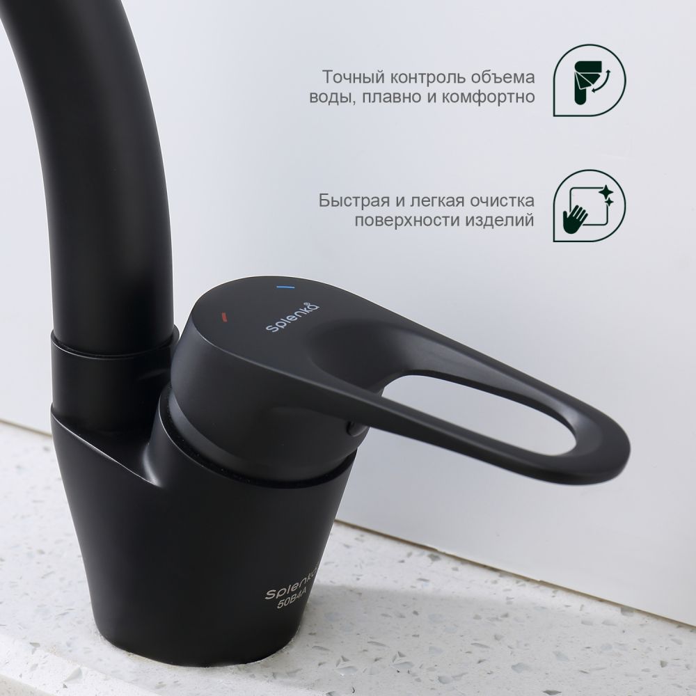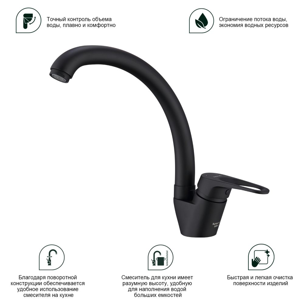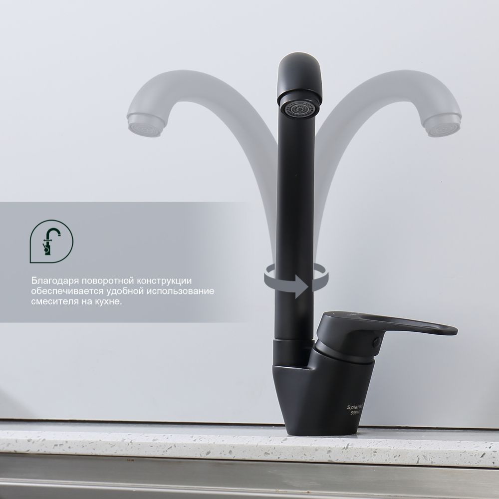 Смеситель для кухни Splenka S202.41.06. Цвет: черный. Кухонные смесители торговой марки SPLENKA широко известны своей надежностью. Строгий контроль качества сопровождает весь цикл производства, включающий материалы и технологии по немецким стандартам: аэратор позволит сэкономить до 30% воды и обеспечит равномерный поток воды. Душевая лейка с двумя функциями, легкое переключение между режимами. Смеситель для кухни имеет разумную высоту, удобную для наполнения водой больших емкостей. Поворотный излив позволяет с большим удобством пользоваться им на кухне. Встроенный аэратор эффективно фильтрует примеси и уменьшает шум от импульсов воды. Гладкая внутренняя стенка обеспечивает мягкий поток воды. Высококлассная технология делает поверхность яркой и блестящей. Подходит к кухонным мойкам практически любых размеров и форм. Быстрый монтаж и простота в обращении позволяют экономить время до 50%. Гарантия на сантехнику от производителя – 5 лет на смеситель и 2 года на покрытие. Комплект включает инструкцию по установке и гарантийный талон.