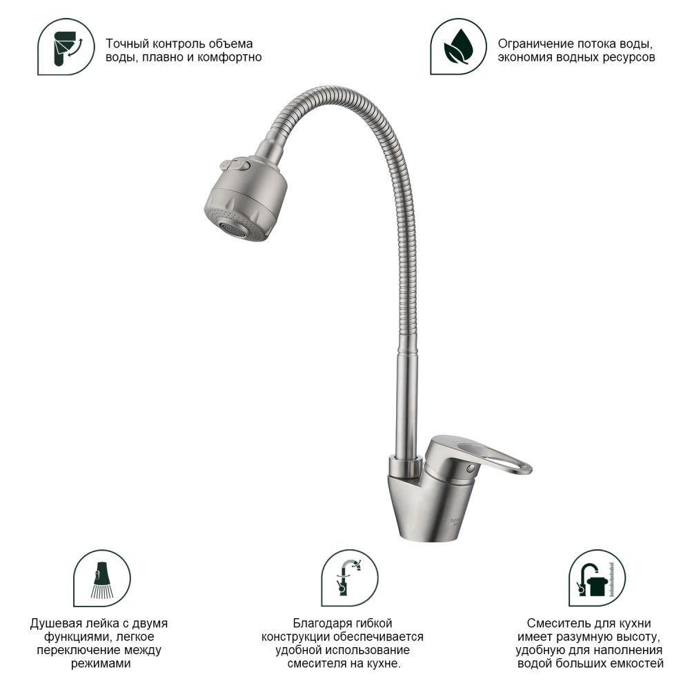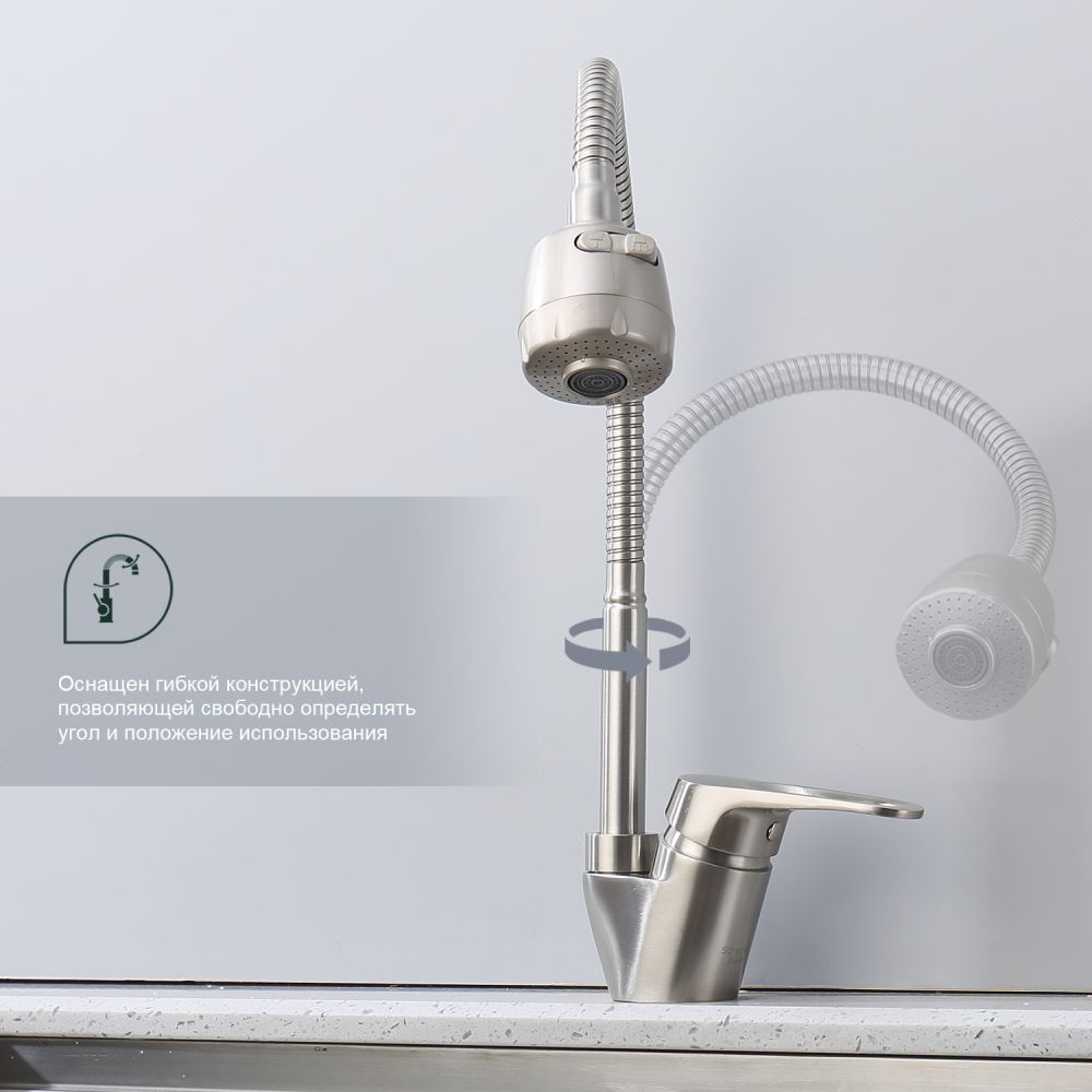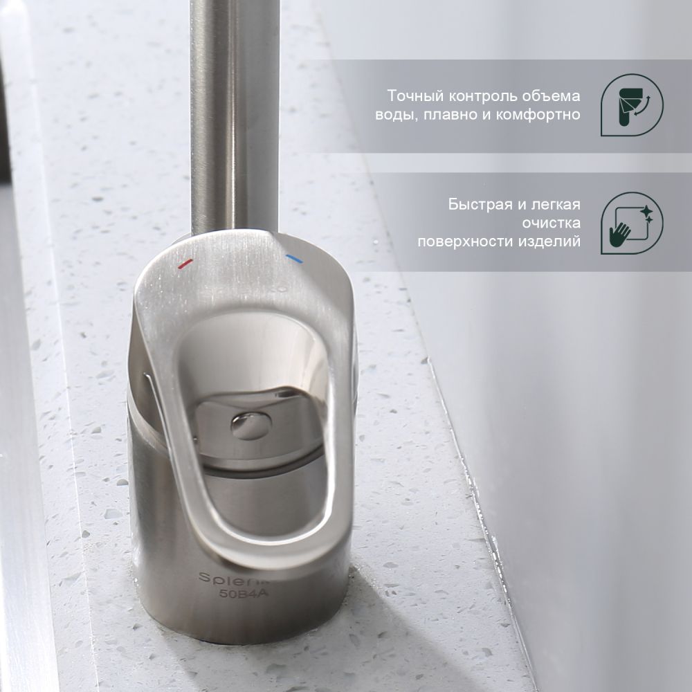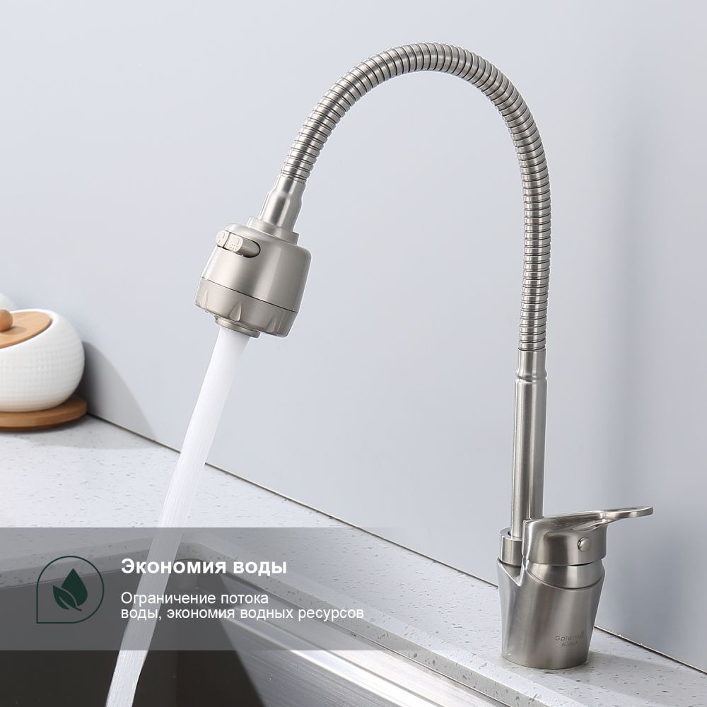 Смеситель для кухни Splenka S202.47.05. Цвет: сатин. Кухонные смесители торговой марки SPLENKA широко известны своей надежностью. Строгий контроль качества сопровождает весь цикл производства, включающий материалы и технологии по немецким стандартам: аэратор позволит сэкономить до 30% воды и обеспечит равномерный поток воды. Душевая лейка с двумя функциями, легкое переключение между режимами. Смеситель для кухни имеет разумную высоту, удобную для наполнения водой больших емкостей. Поворотный излив позволяет с большим удобством пользоваться им на кухне. Встроенный аэратор эффективно фильтрует примеси и уменьшает шум от импульсов воды. Гладкая внутренняя стенка обеспечивает мягкий поток воды. Высококлассная технология делает поверхность яркой и блестящей. Подходит к кухонным мойкам практически любых размеров и форм. Быстрый монтаж и простота в обращении позволяют экономить время до 50%. Гарантия на сантехнику от производителя – 5 лет на смеситель и 2 года на покрытие. Комплект включает инструкцию по установке и гарантийный талон.