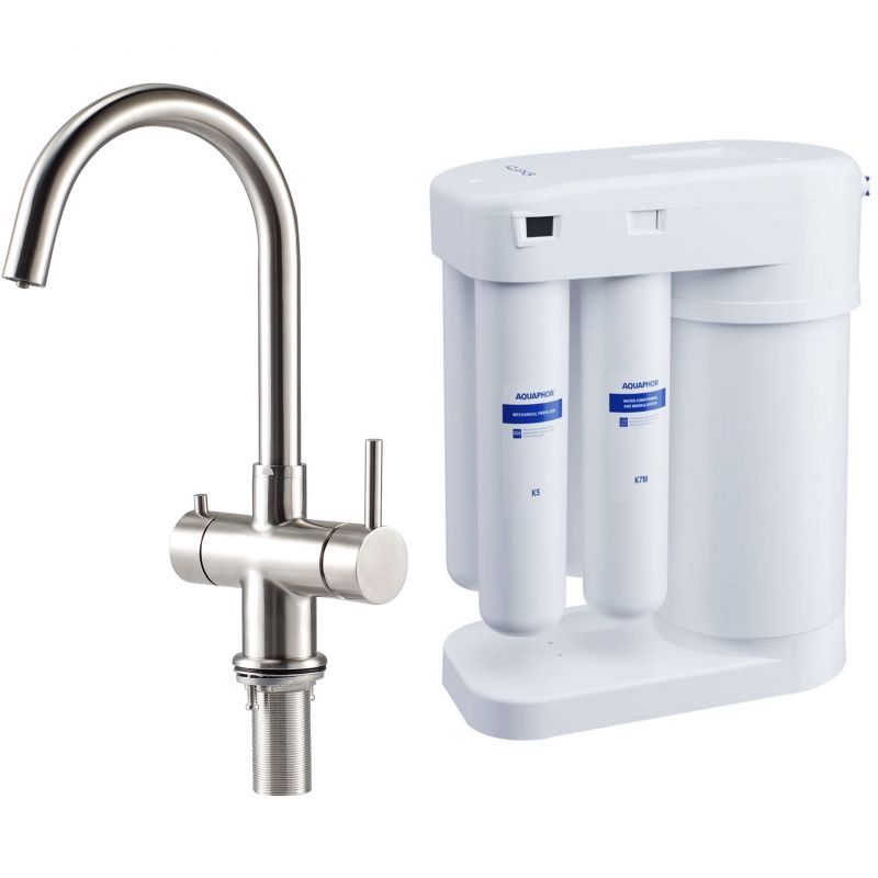 В комплекте: смеситель, комплект фильтров (Аквафор Морион), гибкая подводка, комплект креплений.