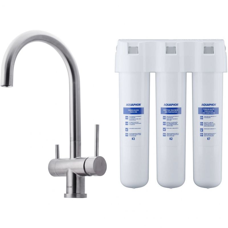 В комплекте: смеситель, комплект фильтров (Аквафор Кристалл), гибкая подводка, комплект креплений.