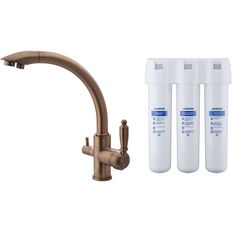 В комплекте: смеситель, комплект фильтров (Аквафор Кристалл), гибкая подводка, комплект креплений.