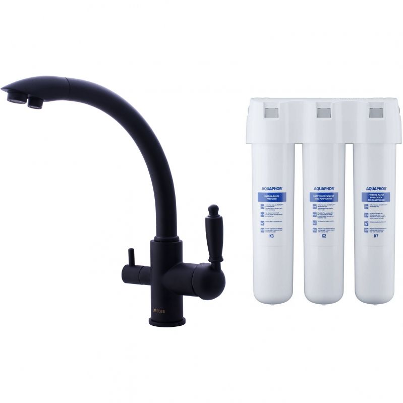 Смеситель для кухни Swedbe Selene Plus 8045K с комплектом фильтров для воды Аквафлор Кристалл. Смеситель изготовлен по европейским стандартам качества и экологического контроля. Предусмотрена дополнительная защита от протечек: установлены два уплотнительных кольца. Радиус поворота излива 360 градусов обеспечивает свободу действий: освобождает при необходимости пространство мойки и позволяет наполнить емкости водой в удобном для вас месте. Фильтр удаляет хлор, тяжёлые металлы, пестициды, нефтепродукты и другие распространённые загрязнители.