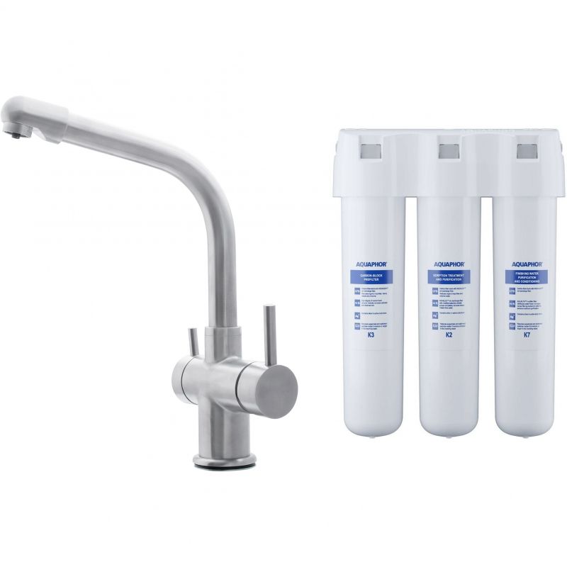 В комплекте: смеситель, комплект фильтров (Аквафор Кристалл), гибкая подводка, комплект креплений.