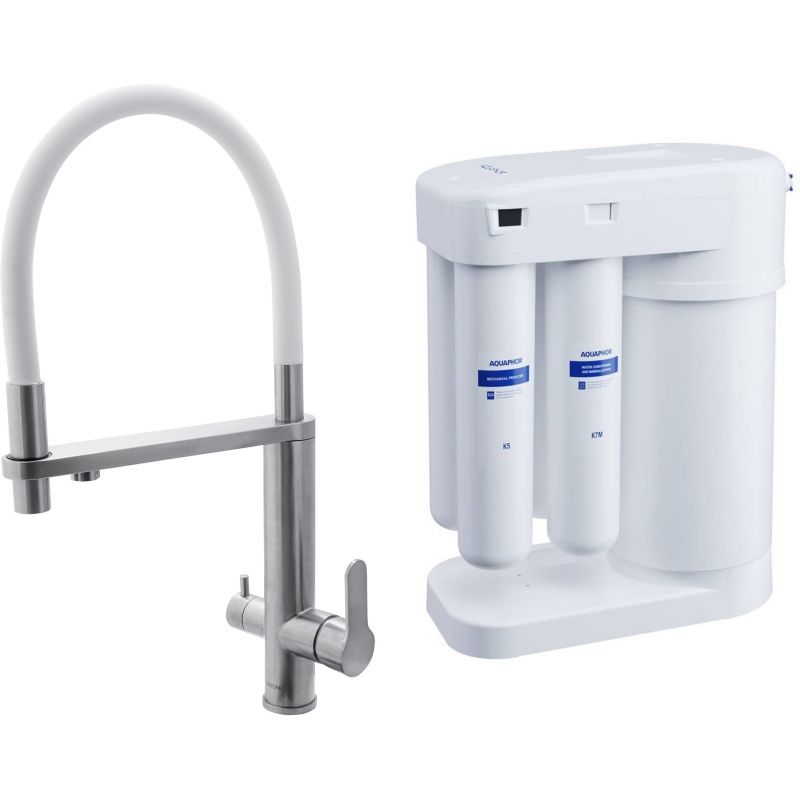 В комплекте: смеситель, комплект фильтров (Аквафор Морион), гибкая подводка, комплект креплений.