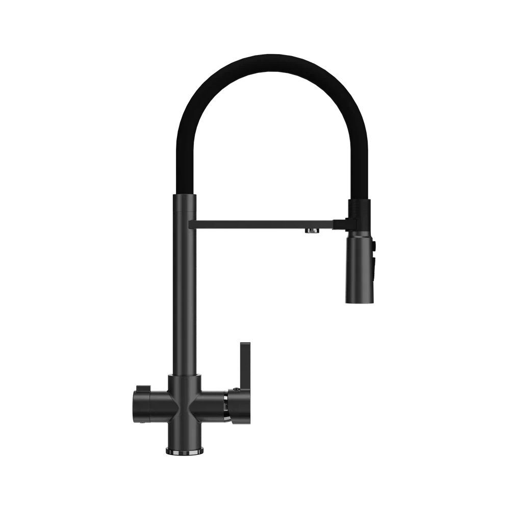 Смеситель ULGRAN U-026 – это стильный современный кухонный смеситель с высоким гибким изливом черного цвета. Материал корпуса выполнен из высококачественной латуни, сверху корпус смесителя покрыт хромом.