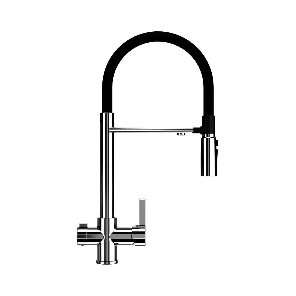 Смеситель ULGRAN U-026 – это стильный современный кухонный смеситель с высоким гибким изливом черного цвета. Материал корпуса выполнен из высококачественной латуни, сверху корпус смесителя покрыт хромом.