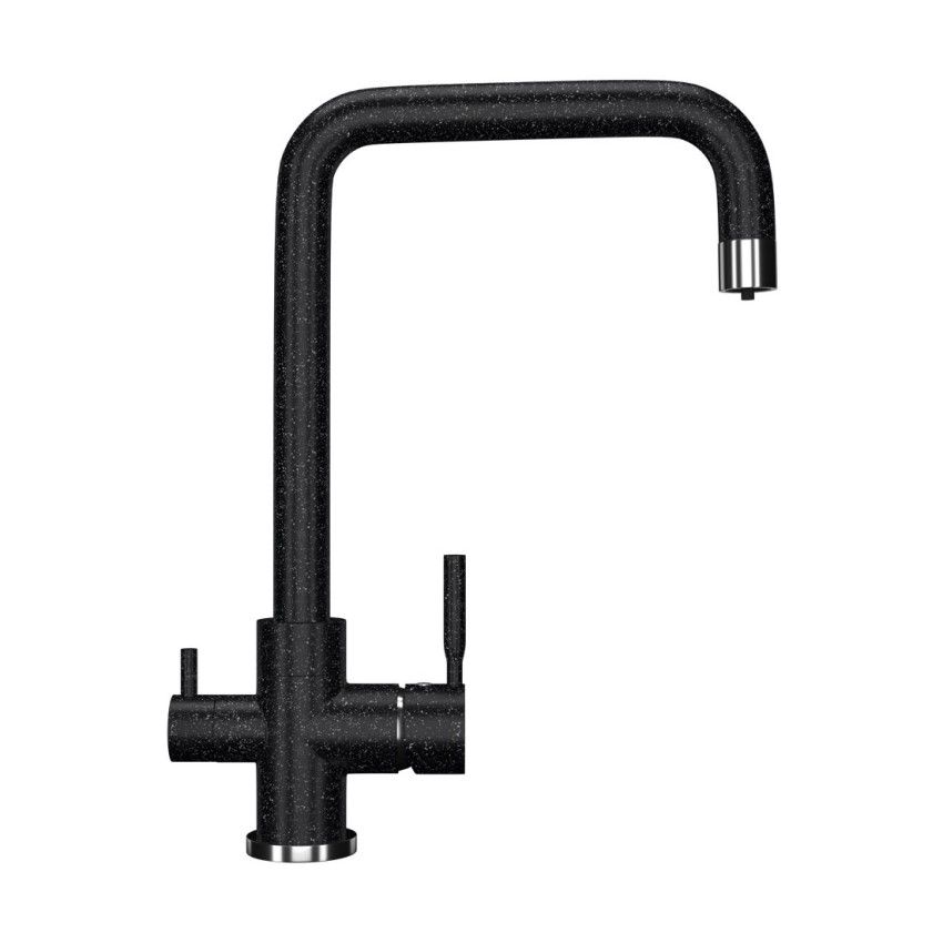 ULGRAN U-019 - современный кухонный смеситель с дополнительным краном для подключения фильтрованной воды, оснащенный кран-буксой с керамическими пластинами. Реализован тройной подвод воды через один излив: холодная, горячая и фильтрованная. Переход с одного подвода на другой производится поворотом рычага. Набор для соединения с фильтром входит в комплект . Система фильтрации приобретается дополнительно и монтируется под мойку, специальный индикатор сообщает о необходимости замены картриджа. Материал корпуса выполнен из высококачественной латуни, а окрашивание под "искусственный камень" в цвет мойки ULGRAN выполняется на собственном производстве, что позволяет идеально попасть в фирменный цвет ULGRAN. В качестве керамического картриджа используется известный бренд Wanhai диаметром 35 мм с высокой пропускной способностью в 500 тысяч циклов "открывания-закрывания". На подвижные части картриджа Wanhai нанесена специальная невымываемая силиконовая смазка, а керамические пластины изготовлены из 96% оксида алюминия, что, в сочетании с высоким качеством шлифовки обеспечивает долговечность, надежность, плавность хода рукоятки. Смеситель оборудован съемным пластиковым аэратором для экономии воды и поворотным изливом на 360 градусов. В комплектацию входя: керамический картридж Wanhai, гибкая подводка, комплект крепежных элементов, кран-букса с керамическими пластинами для дополнительного излива для фильтрованной воды, набор для подсоединения фильтра питьевой воды (гибкая подводка + переходник-цанга), технический паспорт и гарантийный талон. Заводская гарантия составляет 3 года на материал корпуса, 1 год на комплектующие к смесителю и 1 год на материал покрытия.