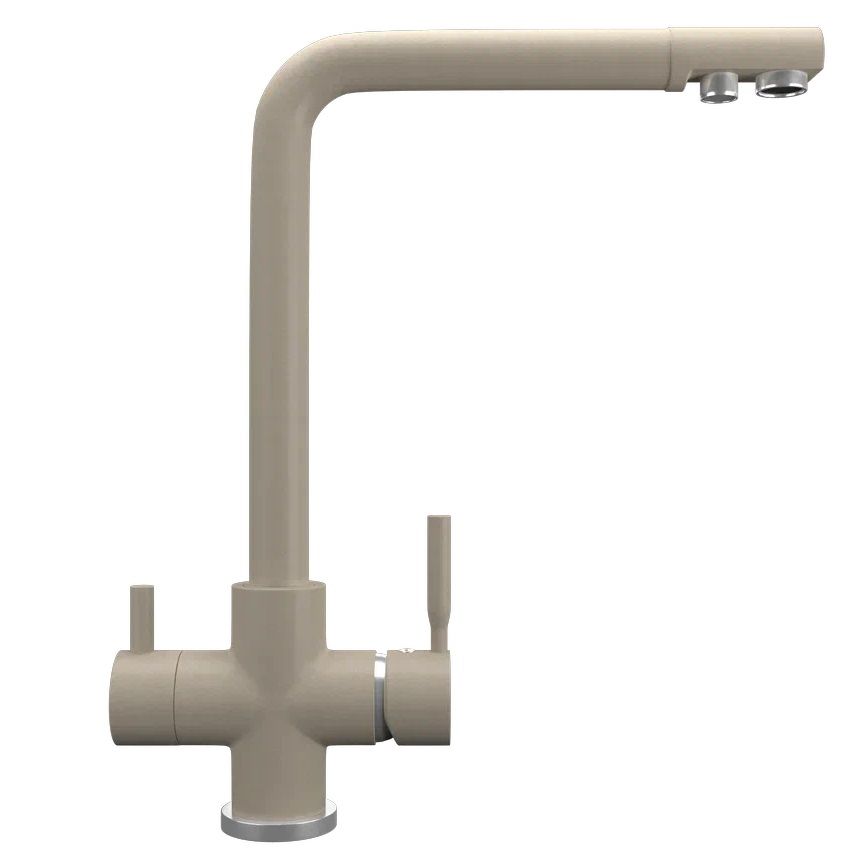 ULGRAN Quartz UQ-016 - высокоэргономичный кухонный смеситель с дополнительным краном для подключения фильтрованной воды, оснащенный кран-буксой с керамическими пластинами. Реализован тройной подвод воды через один излив: холодная, горячая и фильтрованная. Переход с одного подвода на другой производится поворотом рычага. Набор для соединения с фильтром входит в комплект . Система фильтрации приобретается дополнительно и монтируется под мойку, специальный индикатор сообщает о необходимости замены картриджа. Материал корпуса выполнен из высококачественной латуни, а окрашивание под "искусственный камень" в цвет мойки ULGRAN Quart выполняется на собственном производстве, что позволяет идеально попасть в фирменный цвет ULGRAN Quart. В качестве керамического картриджа используется известный бренд Wanhai диаметром 35 мм с высокой пропускной способностью в 500 тысяч циклов "открывания-закрывания". На подвижные части картриджа Wanhai нанесена специальная невымываемая силиконовая смазка, а керамические пластины изготовлены из 96% оксида алюминия, что, в сочетании с высоким качеством шлифовки обеспечивает долговечность, надежность, плавность хода рукоятки. Смеситель оборудован съемным пластиковым аэратором для экономии воды и поворотным изливом на 360 градусов. В комплектацию входят: керамический картридж Wanhai, гибкая подводка, комплект крепежных элементов, кран-букса с керамическими пластинами для дополнительного излива для фильтрованной воды, набор для подсоединения фильтра питьевой воды (гибкая подводка + переходник-цанга), технический паспорт и гарантийный талон. Заводская гарантия составляет 3 года на материал корпуса, 1 год на комплектующие к смесителю и 1 год на материал покрытия.