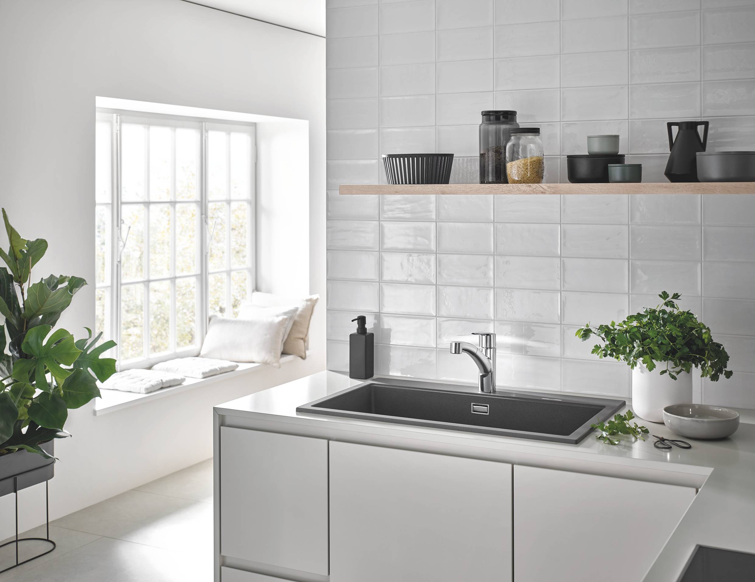 гибкая подводка, керамический картридж GROHE SilkMove, поверхность GROHE StarLight, система быстрого монтажа, смеситель |