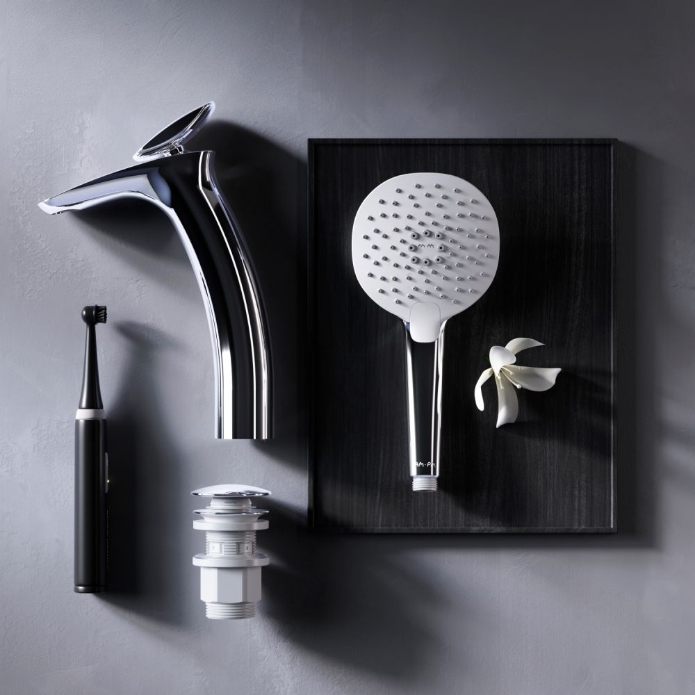 Наклон и плавный изгиб высокого корпуса смесителя с одной стороны придают неповторимую динамику дизайну с другой — обеспечивают удобство использования на раковине с глубокой чашей.