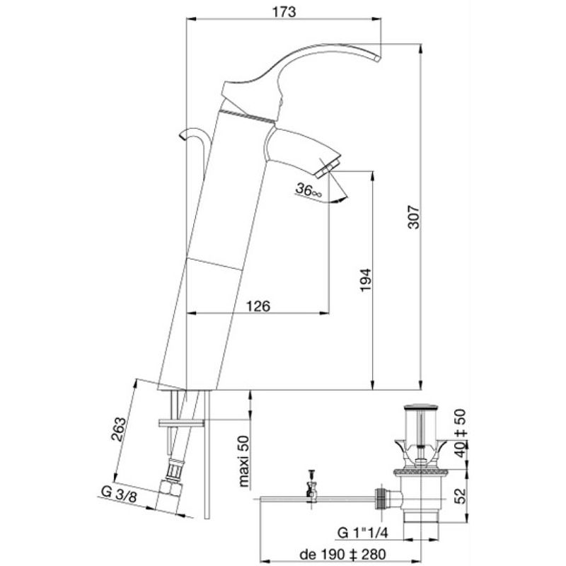 В комплекте поставки: смеситель, гибкая подводка, донный клапан.