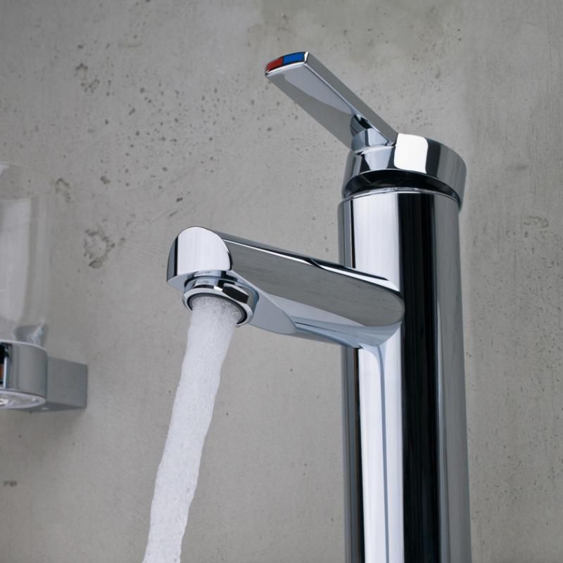 Смеситель Keuco Plan Blue 53902 010000 для раковины однорычажный с донным клапаном. Оснащение - аэратор, система быстрого монтажа, сливной гарнитур, гибкая подводка.