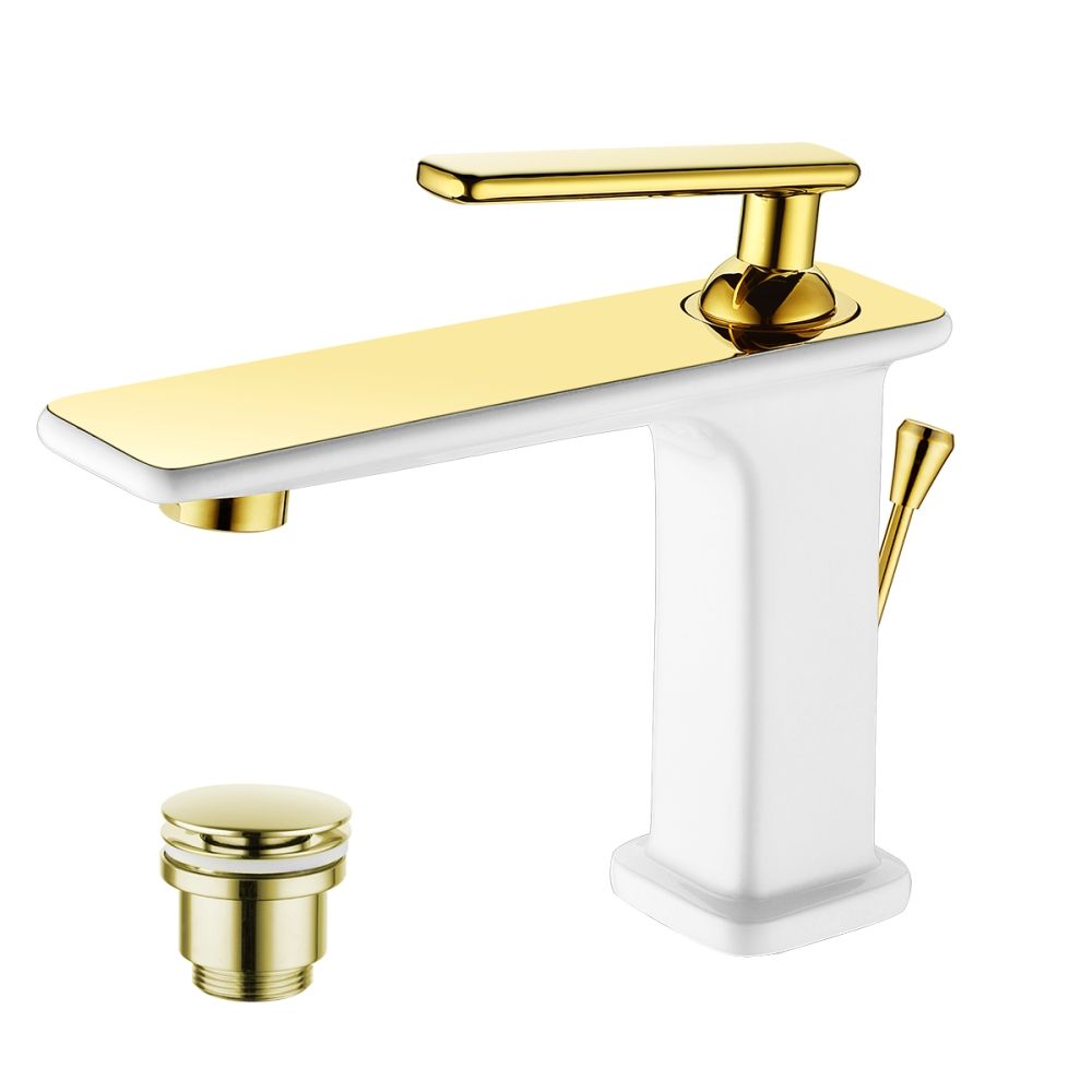 Монолитный смеситель для раковины Lemark Mista изготовлен из латуни в оригинальном дизайном с контрастными деталями в белом и золотом цветах. Смеситель имеет прямоугольную форму, рукоятка изготовлена из металла.