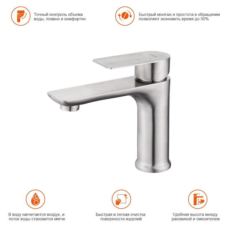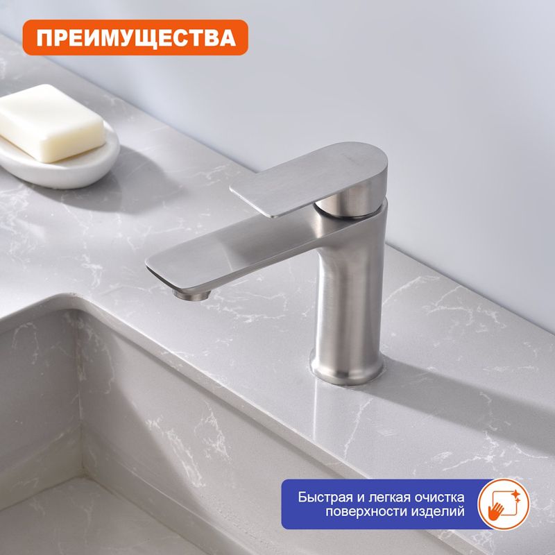 Смеситель для раковины Prohanss P35.10.05, сатин — это идеальное сочетание современного минималистичного дизайна и высокого качества. Изготовленный из нержавеющей стали этот кран для умывальника обеспечивает долговечность и надёжность в использовании, а также устойчивость к механическим повреждениям. Механизм смесителя для раковины основан на керамическом картридже с рычажным управлением, что гарантирует лёгкость и точность регулировки температуры и напора воды. Его минималистичный дизайн станет настоящим украшением вашей ванной комнаты, гармонично вписываясь в любой интерьер благодаря лаконичным формам и элегантным линиям.