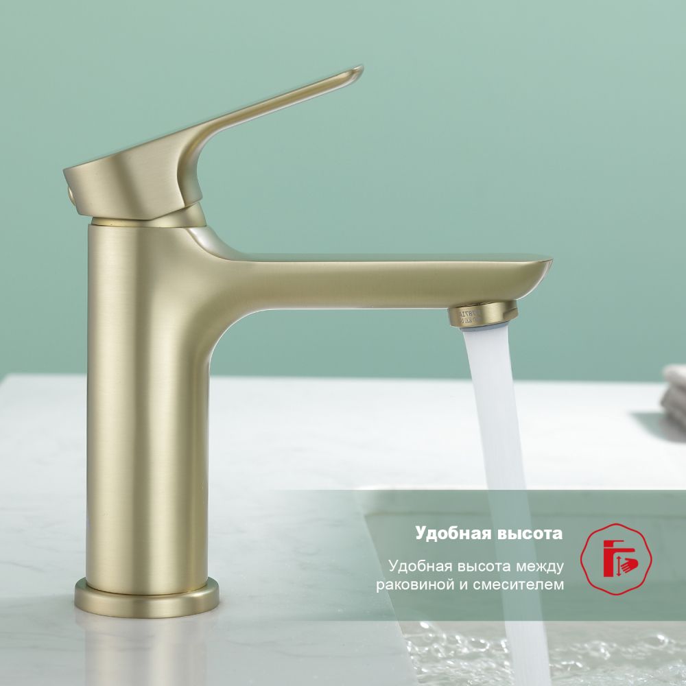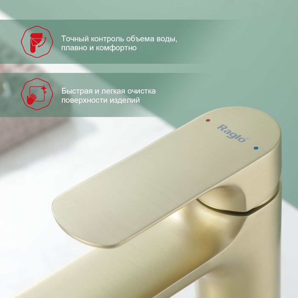 Смеситель для раковины Raglo R03.10.03, сатин золотой. Смеситель для раковины RAGLО имеет повышенную прочность корпуса. Соответствует требованиям международного стандарта. Одна рукоять для регулировки воды. Аэратор гарантирует одинаковый поток воды, сеточка рассеивает напор, вода смягчается. Смеситель устанавливается на гайке, нижняя часть смесителя вставляется в отверстие для монтажа и затягивается гайкой для фиксации. Данный Смеситель для раковины имеет надежный стационарный излив, не меняющий своего положении. Смеситель прекрасно смешивает потоки воды, а помимо этого обладает невысоки показателем шумов. Быстрый монтаж. Гарантия производителя 7 лет.