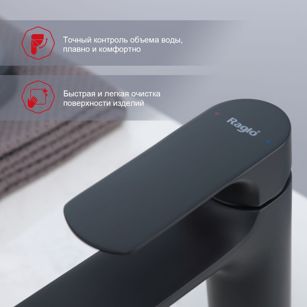 Смеситель для раковины Raglo R03.10.06, черный. Смеситель для раковины RAGLО имеет повышенную прочность корпуса. Соответствует требованиям международного стандарта. Одна рукоять для регулировки воды. Аэратор гарантирует одинаковый поток воды, сеточка рассеивает напор, вода смягчается. Смеситель устанавливается на гайке, нижняя часть смесителя вставляется в отверстие для монтажа и затягивается гайкой для фиксации. Данный Смеситель для раковины имеет надежный стационарный излив, не меняющий своего положении. Смеситель прекрасно смешивает потоки воды, а помимо этого обладает невысоки показателем шумов. Быстрый монтаж. Гарантия производителя 7 лет.