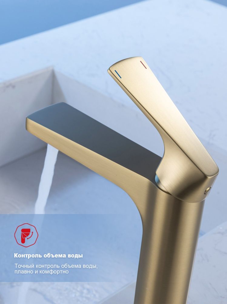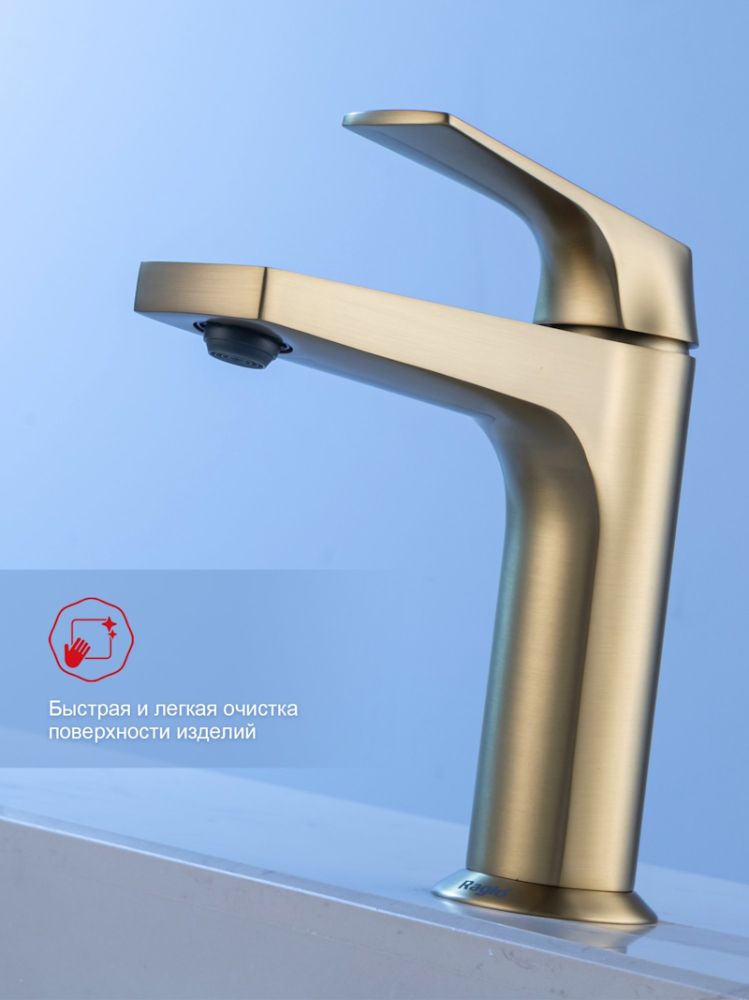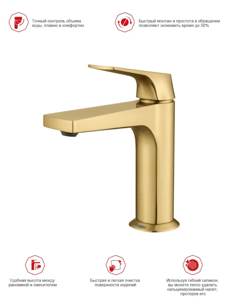 Смеситель для раковины Raglo R07.10.03 в цвете золотой сатин ("матовое золото") — это идеальное сочетание современного минималистичного дизайна и высокого качества. Изготовленный из высококачественной латуни, этот кран для умывальника обеспечивает долговечность и надёжность в использовании, а также устойчивость к механическим повреждениям. Механизм смесителя для раковины основан на керамическом картридже с рычажным управлением, что гарантирует лёгкость и точность регулировки температуры и напора воды. Дизайн этого смесителя станет настоящим украшением вашей ванной комнаты, гармонично вписываясь в любой интерьер благодаря лаконичным формам и элегантным линиям.