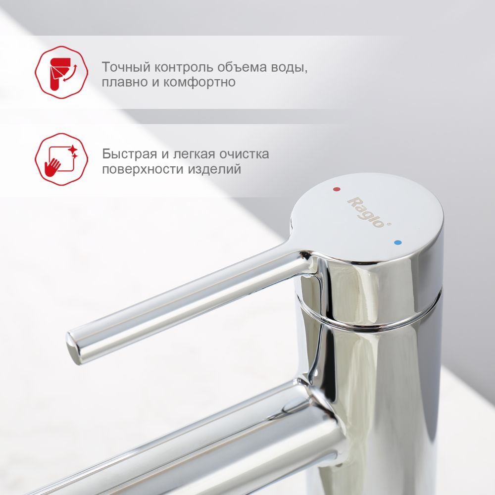 Смеситель для раковины Raglo R20.10, хром. Смеситель для раковины RAGLО имеет повышенную прочность корпуса. Соответствует требованиям международного стандарта. Одна рукоять для регулировки воды. Аэратор гарантирует одинаковый поток воды, сеточка рассеивает напор, вода смягчается. Смеситель устанавливается на гайке, нижняя часть смесителя вставляется в отверстие для монтажа и затягивается гайкой для фиксации. Данный Смеситель для раковины имеет надежный стационарный излив, не меняющий своего положении. Смеситель прекрасно смешивает потоки воды, а помимо этого обладает невысоким показателем шумов. Быстрый монтаж. Крепление на усиленной гайке. Подводка длиной 55 см имеет латунные гайки. Гарантия на смеситель 7 лет.