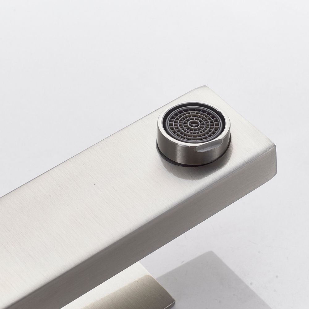 Излив смесителя оснащен аэратором, который помогает экономить воду и обеспечивает равномерный поток. Крепление осуществляется при помощи гайки, что обеспечивает надежную фиксацию.