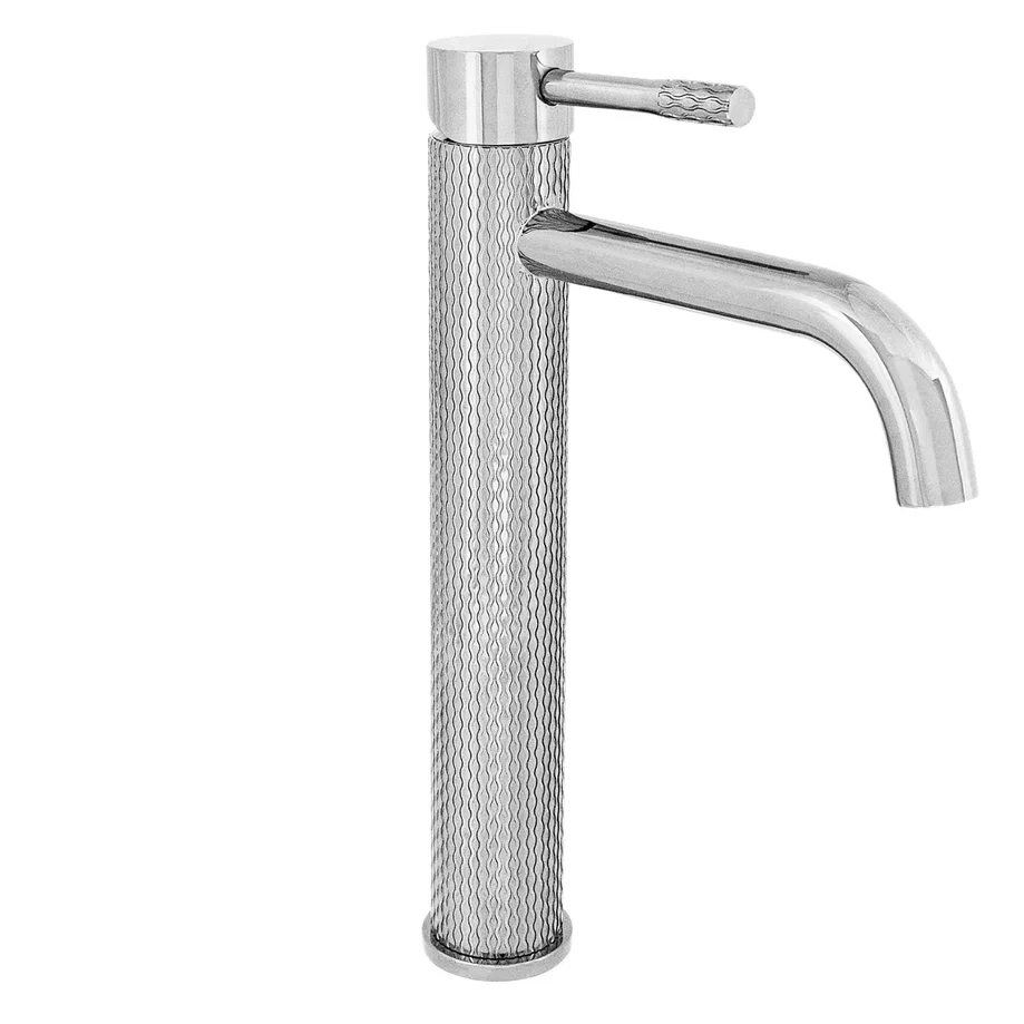 Современный однорычажный смеситель для умывальника с высоким рельефным корпусом и монолитным изливом от компании «СЛАВЕН» c собственной сборочной линией полного цикла в Подмосковье.