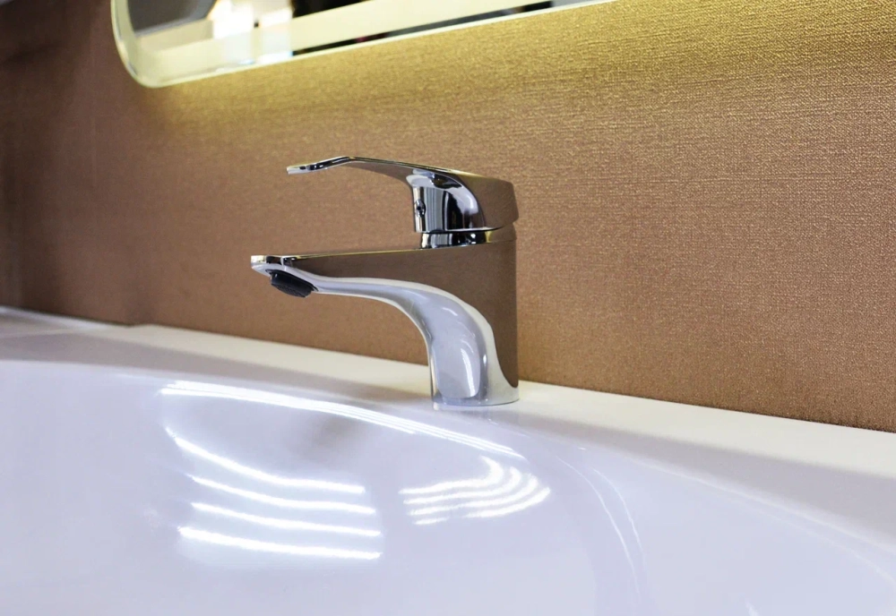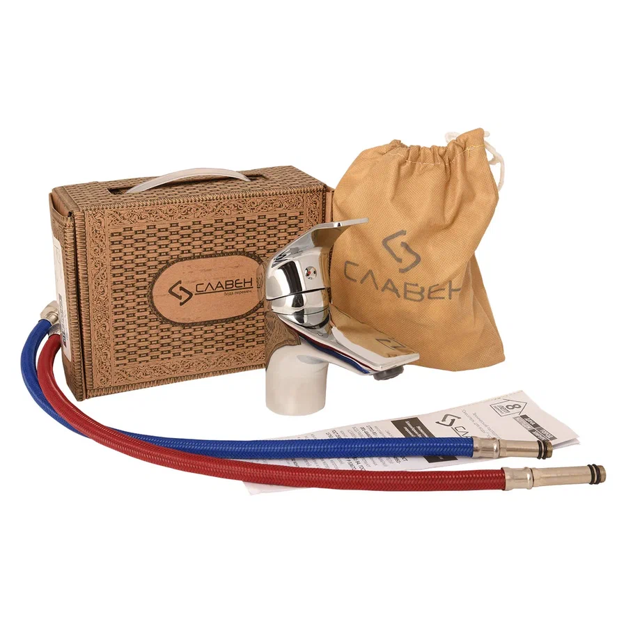 Современный однорычажный смеситель для раковины с коротким монолитным изливом от компании «СЛАВЕН» c собственной сборочной линией полного цикла в Подмосковье.
