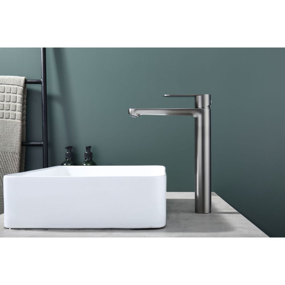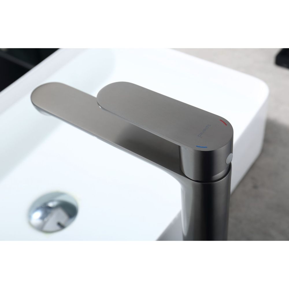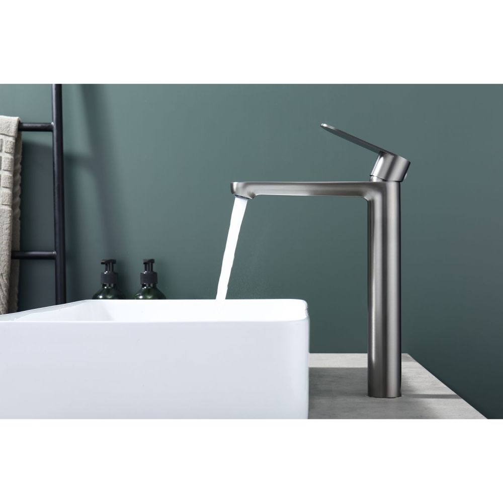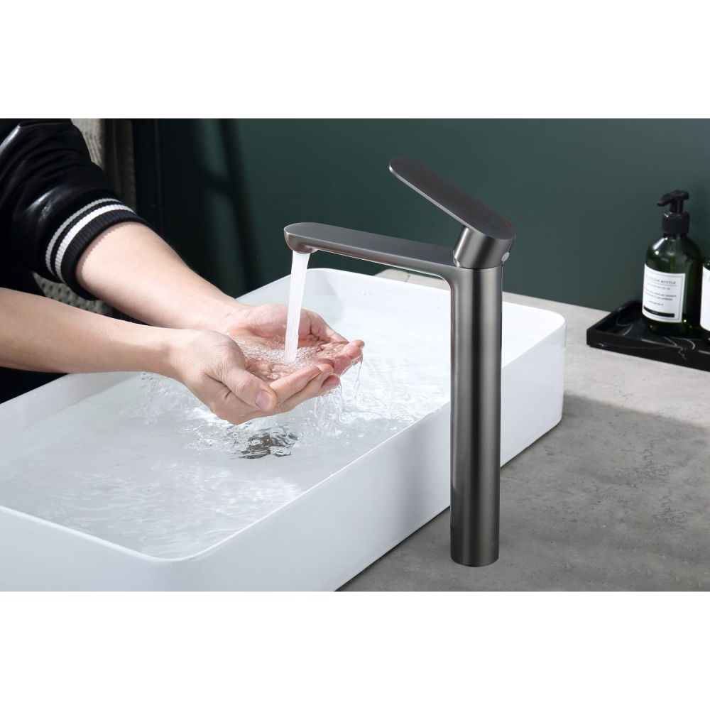 Смеситель для раковины Splenka S222.15.09, графит. Смеситель высокий для раковины нержавеющая сталь, округлой формы. Смеситель с креплением на гайке. Все для монтажа и эксплуатации есть в комплекте.
