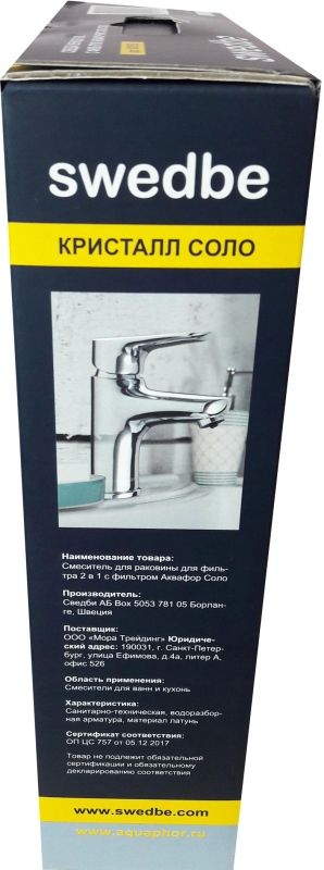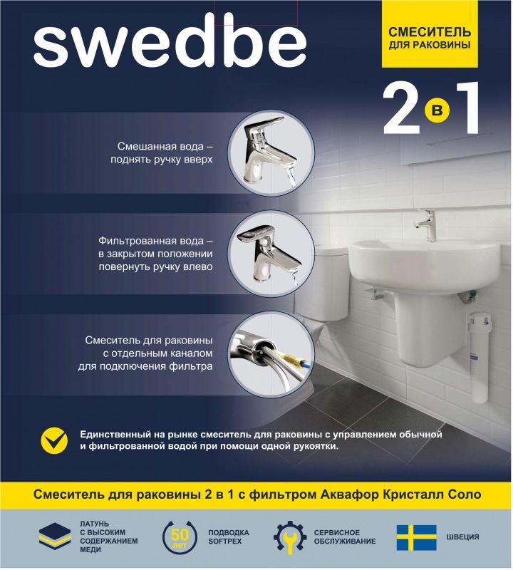 Однорычажный смеситель для раковины Swedbe Venado Plus K1615S с фильтром для воды Аквафор Соло. Смеситель имеет полностью изолированный канал для фильтрованной воды. Устойчивая к коррозии и минеральным отложениям гибкая подводка SoftPEX прослужит долгих 50 лет, не допуская протечек. Фильтр очистит воду от самых распространенных примесей, включая хлор, органические соединения, тяжелые металлы, ржавчину, фенолы, остатки лекарственных средств.
