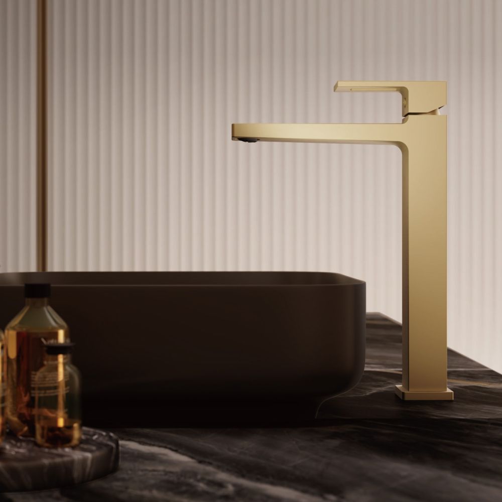 Высокий смеситель для раковины BELZ B11658-5 в цвете "брашированное золото" — это стильное и функциональное решение для вашей ванной комнаты, предназначенное для использования с раковинами-чашами. Его современный минималистичный дизайн с угловатыми формами придаёт интерьеру выразительность и строгость. Изготовленный из прочной латуни, смеситель отличается долговечностью и устойчивостью к коррозии, что гарантирует его долгий срок службы.