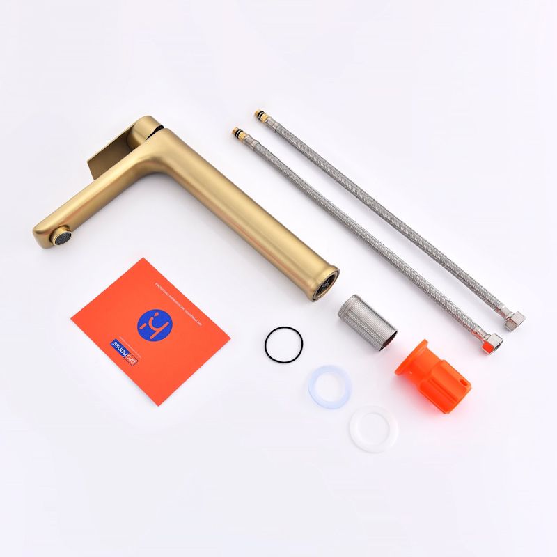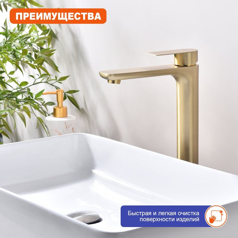 Смеситель для раковины высокий Prohanss P35.15.03, золотой сатин — это идеальное сочетание современного минималистичного дизайна и высокого качества. Изготовленный из нержавеющей стали этот высокий кран для умывальника обеспечивает долговечность и надёжность в использовании, а также устойчивость к механическим повреждениям. Механизм смесителя для раковины основан на керамическом картридже с рычажным управлением, что гарантирует лёгкость и точность регулировки температуры и напора воды. Его минималистичный дизайн станет настоящим украшением вашей ванной комнаты, гармонично вписываясь в любой интерьер благодаря лаконичным формам и элегантным линиям.