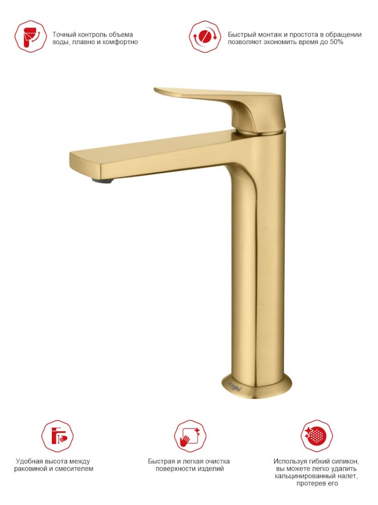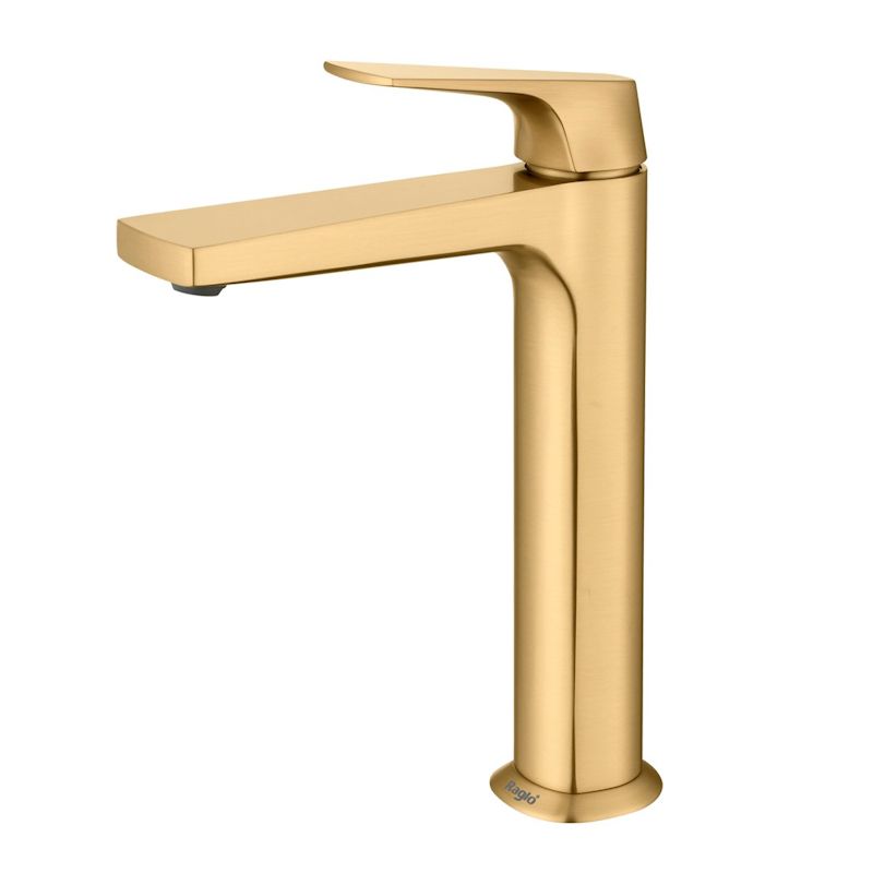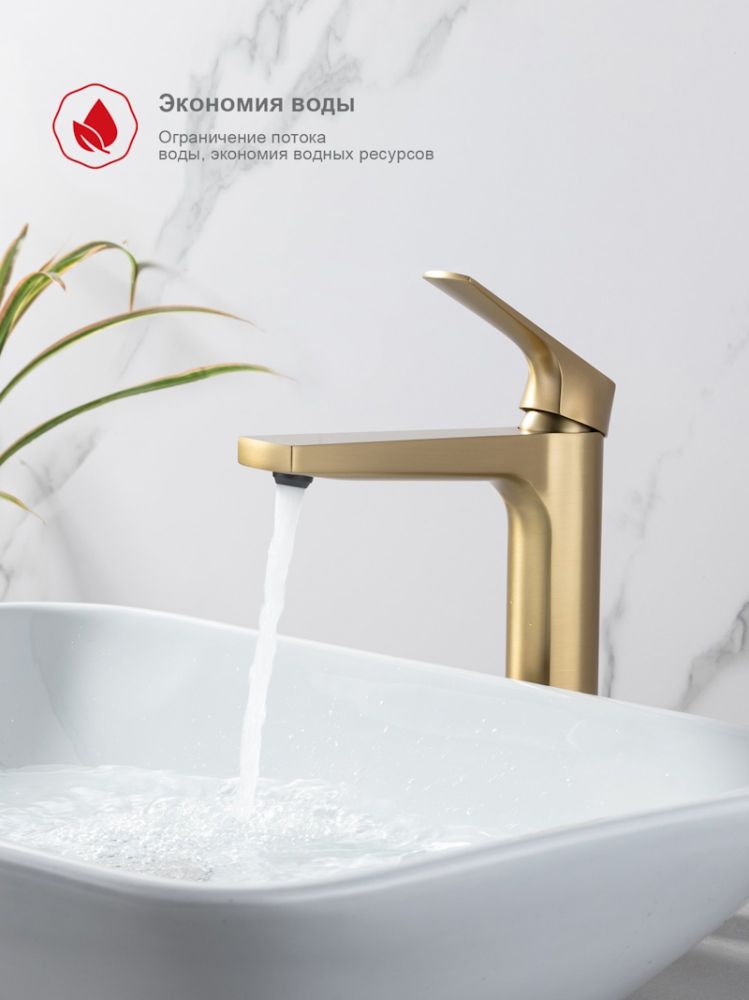 Смеситель для раковины высокий Raglo R07.15.03, золотой сатин (матовое золото) — это идеальное сочетание современного минималистичного дизайна и высокого качества. Изготовленный из латуни, этот высокий кран для умывальника обеспечивает долговечность и надёжность в использовании, а также устойчивость к механическим повреждениям. Механизм смесителя для раковины основан на керамическом картридже с рычажным управлением, что гарантирует лёгкость и точность регулировки температуры и напора воды. Его минималистичный дизайн станет настоящим украшением вашей ванной комнаты, гармонично вписываясь в любой интерьер благодаря лаконичным формам и элегантным линиям.
