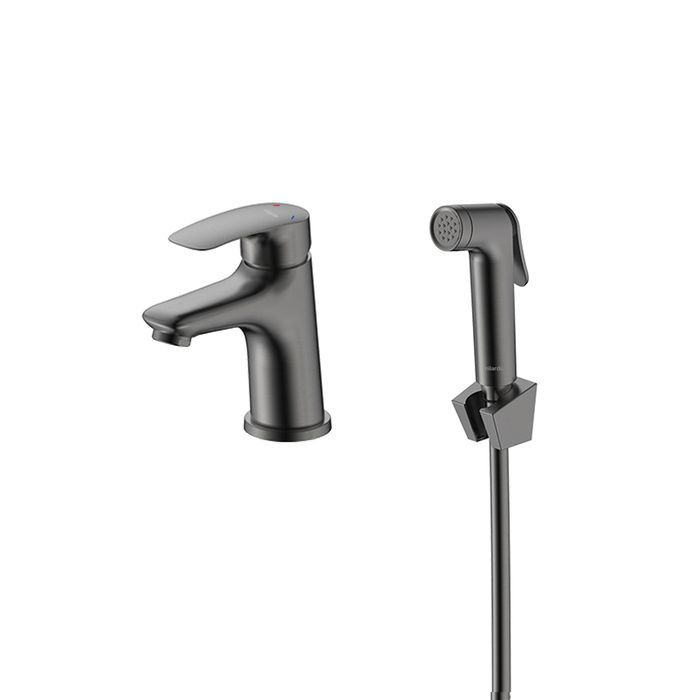 Смеситель с гигиеническим душем Rora отличается универсальным характером: основной акцент в его дизайне приходится на плавные линии корпуса. Модель в графитовом цвете одинаково выигрышно смотрится на контрастных белоснежных раковинах и дополняет собой керамику темных оттенков.