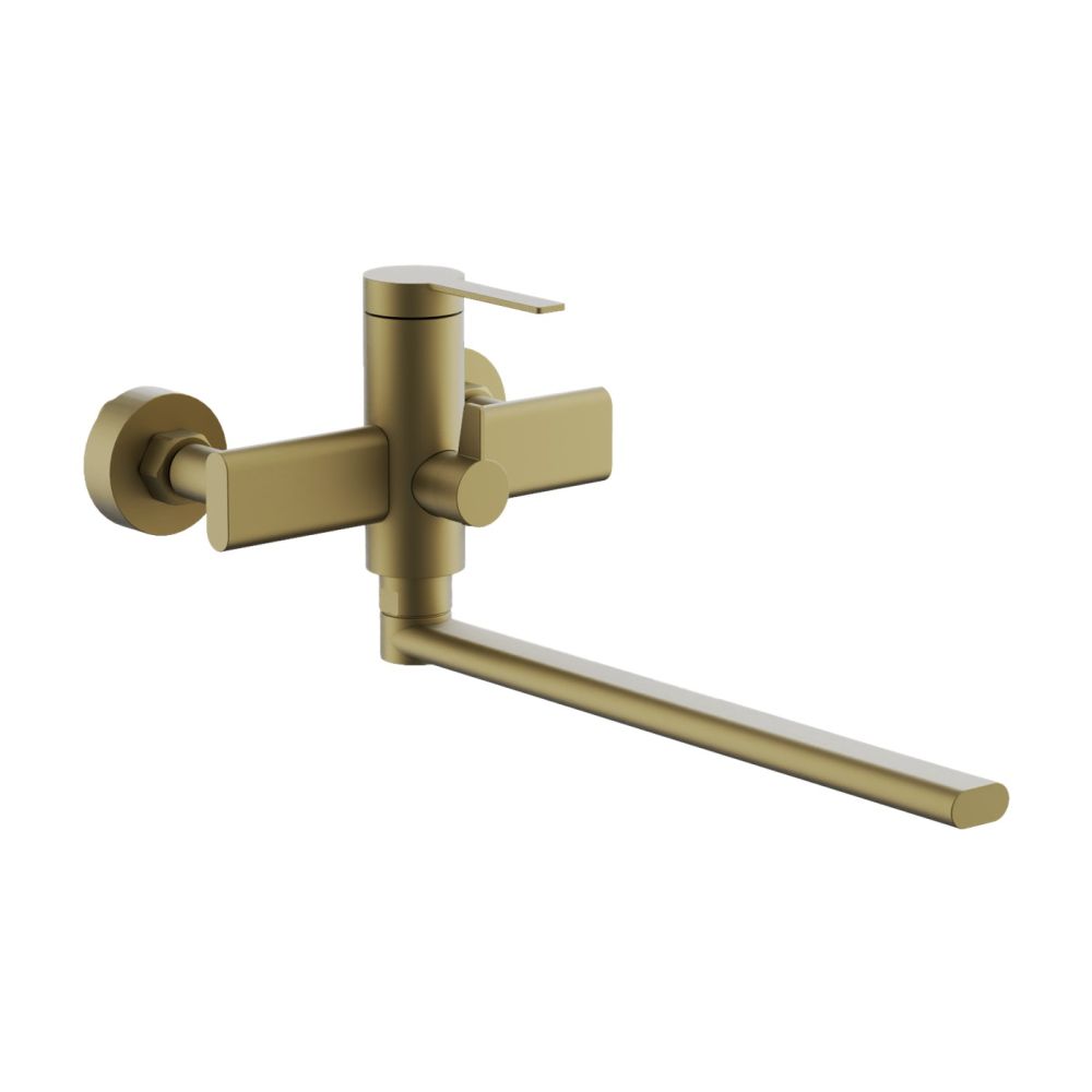 Длинный поворотный излив, оснащённый аэратором, позволяет удобно наполнять ванну и способствует экономии воды, делая струю мягче и равномернее. Классический настенный монтаж через эксцентрики с межосевым расстоянием 150 мм обеспечивает простоту установки. В комплекте с смесителем идёт трёхрежимная душевая лейка из ABS-пластика, которая предлагает разнообразные варианты водных процедур, и душевой шланг в двойной металлической оплётке длиной 150 см, что гарантирует его надёжность и долговечность.