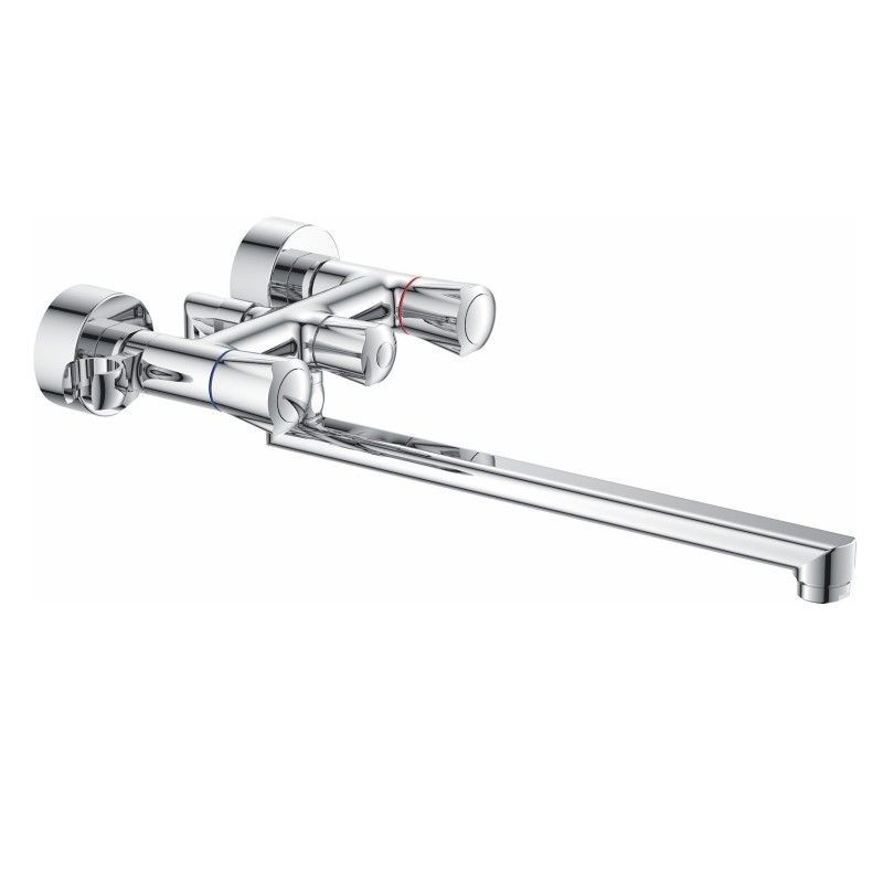 Смеситель изготовлен из металлического сплава. Переключатель потоков на корпусе смесителя. Диаметр декоративных чашек 60 мм. Душевой гарнитур в комплекте. Межосевое расстояние (расстояние между выходом горячей и холодной трубы) 150 мм. Данное расстояние изменяется за счет входящих в комплект эксцентриков на 15 мм. в большую или меньшую стороны. Цвет хром
