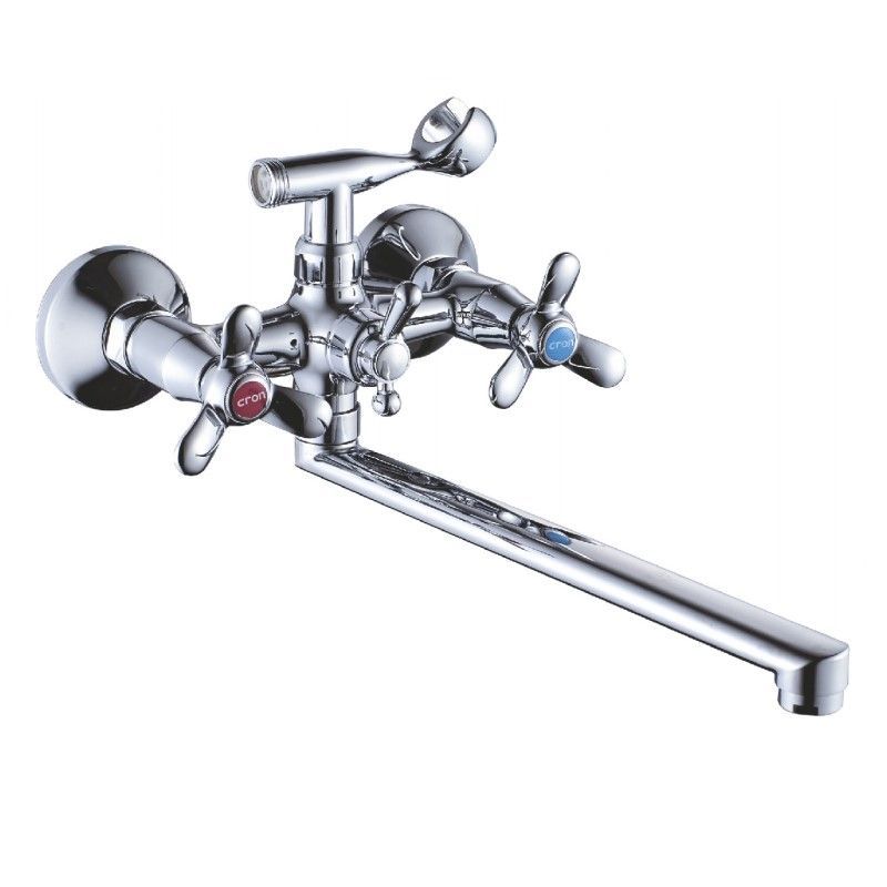 Смеситель изготовлен из металлического сплава. Переключатель потоков на корпусе смесителя. Держатель лейки на корпусе смесителя. Диаметр декоративных чашек 70 мм. Душевой гарнитур в комплекте. Межосевое расстояние (расстояние между выходом горячей и холодной трубы) 150 мм. Данное расстояние изменяется за счет входящих в комплект эксцентриков на 15 мм. в большую или меньшую стороны. Цвет хром