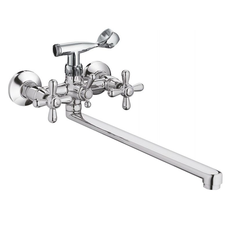 Смеситель изготовлен из металлического сплава. Переключатель потоков на корпусе смесителя. Держатель лейки на корпусе смесителя. Диаметр декоративных чашек 70 мм. Душевой гарнитур в комплекте. Межосевое расстояние (расстояние между выходом горячей и холодной трубы) 150 мм. Данное расстояние изменяется за счет входящих в комплект эксцентриков на 15 мм. в большую или меньшую стороны. Цвет хром