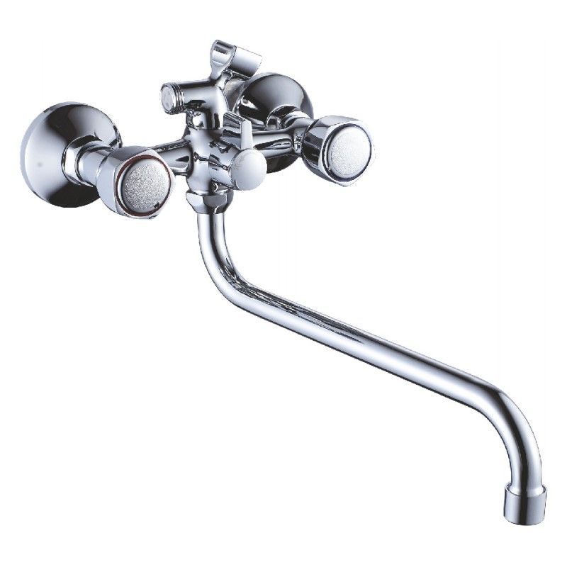 Смеситель изготовлен из металлического сплава. Переключатель потоков на корпусе смесителя. Держатель лейки на корпусе смесителя. Диаметр декоративных чашек 70 мм. Душевой гарнитур в комплекте. Межосевое расстояние (расстояние между выходом горячей и холодной трубы) 150 мм. Данное расстояние изменяется за счет входящих в комплект эксцентриков на 15 мм. в большую или меньшую стороны. Цвет хром