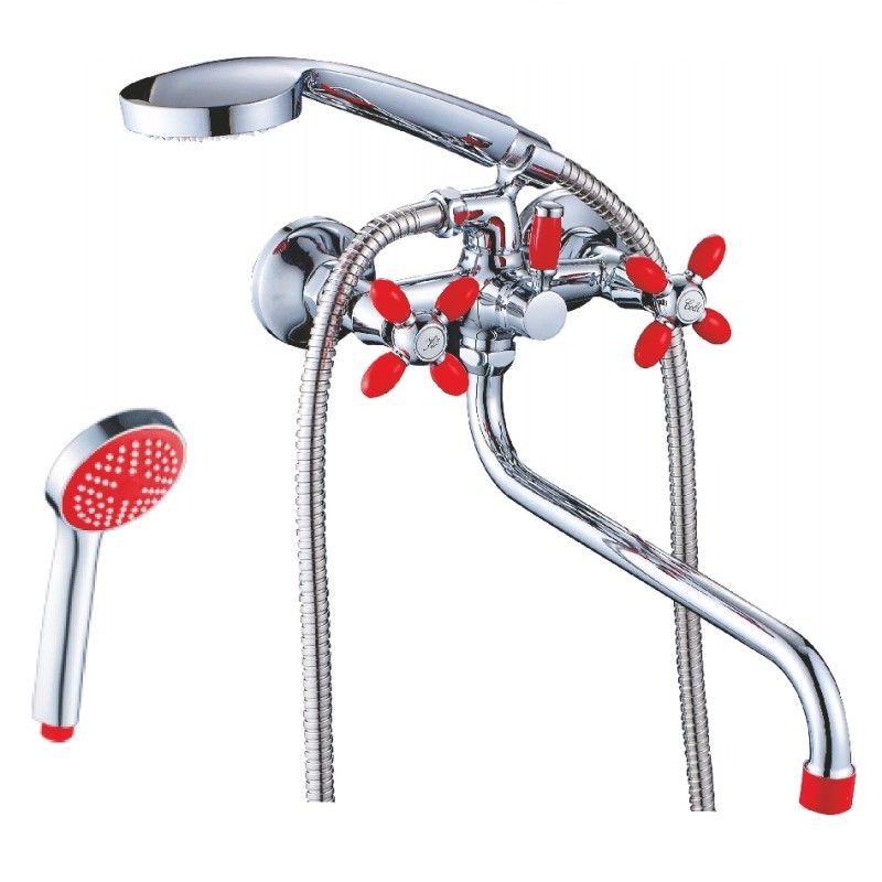 Смеситель изготовлен из металлического сплава. Переключатель потоков на корпусе смесителя. Держатель лейки на корпусе смесителя. Диаметр декоративных чашек 70 мм. Душевой гарнитур в комплекте. Межосевое расстояние (расстояние между выходом горячей и холодной трубы) 150 мм. Данное расстояние изменяется за счет входящих в комплект эксцентриков на 15 мм. в большую или меньшую стороны. Цвет хром/красный