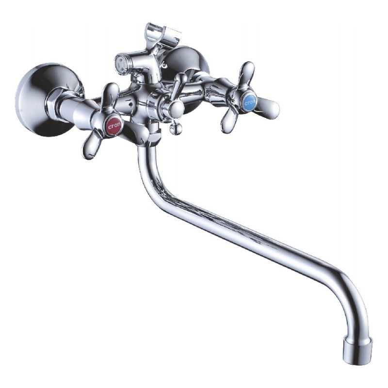 Смеситель изготовлен из металлического сплава. Переключатель потоков на корпусе смесителя. Держатель лейки на корпусе смесителя. Диаметр декоративных чашек 70 мм. Душевой гарнитур в комплекте. Межосевое расстояние (расстояние между выходом горячей и холодной трубы) 150 мм. Данное расстояние изменяется за счет входящих в комплект эксцентриков на 15 мм. в большую или меньшую стороны. Цвет хром