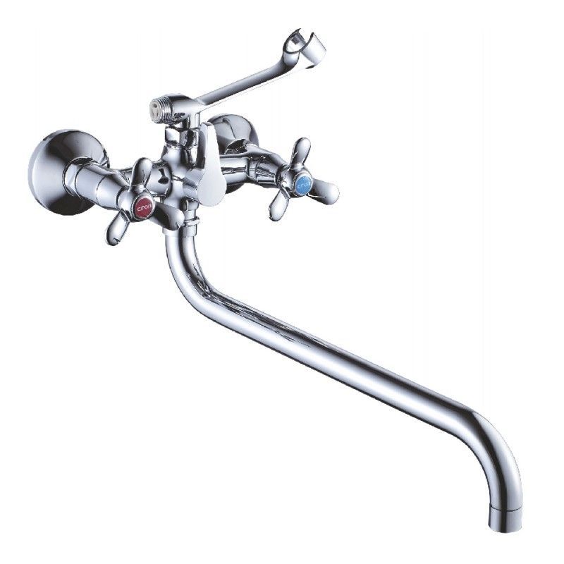 Смеситель изготовлен из металлического сплава. Переключатель потоков на корпусе смесителя. Держатель лейки на корпусе смесителя. Диаметр декоративных чашек 70 мм. Душевой гарнитур в комплекте. Межосевое расстояние (расстояние между выходом горячей и холодной трубы) 150 мм. Данное расстояние изменяется за счет входящих в комплект эксцентриков на 15 мм. в большую или меньшую стороны. Цвет хром