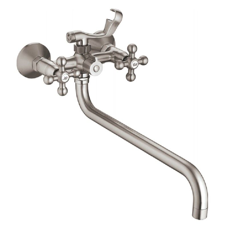 Смеситель изготовлен из металлического сплава. Переключатель потоков на корпусе смесителя. Держатель лейки на корпусе смесителя. Диаметр декоративных чашек 70 мм. Душевой гарнитур в комплекте. Межосевое расстояние (расстояние между выходом горячей и холодной трубы) 150 мм. Данное расстояние изменяется за счет входящих в комплект эксцентриков на 15 мм. в большую или меньшую стороны. Цвет сатин
