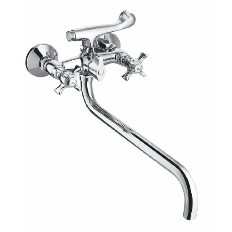 Смеситель изготовлен из металлического сплава. Переключатель потоков на корпусе смесителя. Держатель лейки на корпусе смесителя. Диаметр декоративных чашек 70 мм. Душевой гарнитур в комплекте. Межосевое расстояние (расстояние между выходом горячей и холодной трубы) 150 мм. Данное расстояние изменяется за счет входящих в комплект эксцентриков на 15 мм. в большую или меньшую стороны. Цвет хром
