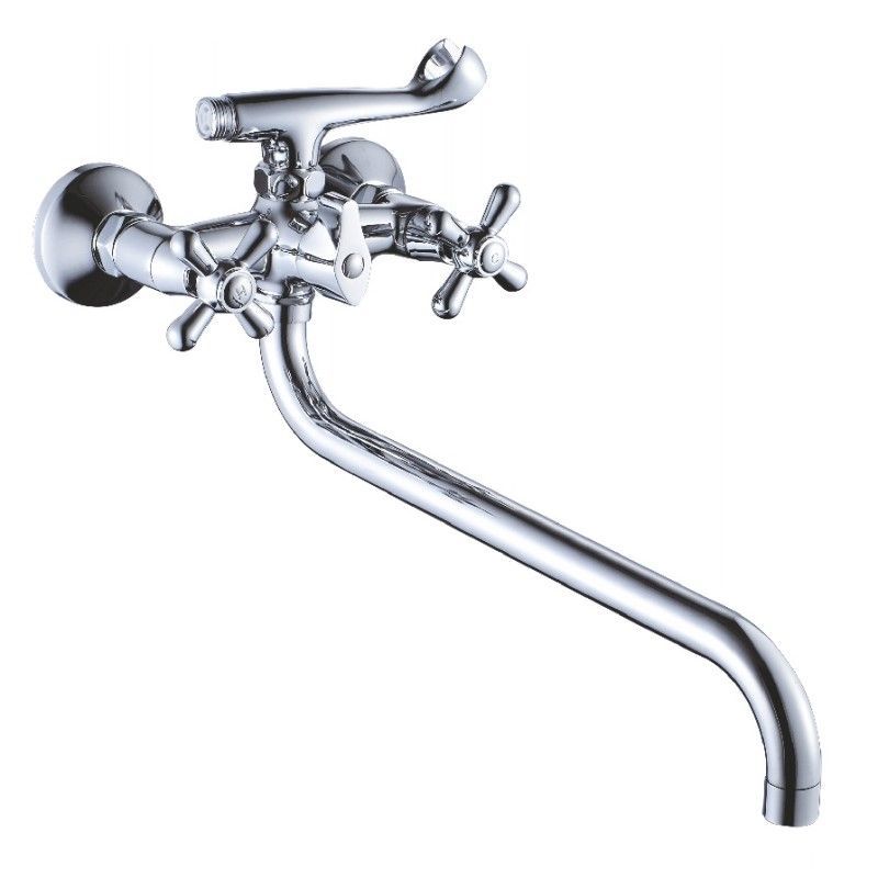 Смеситель изготовлен из металлического сплава. Переключатель потоков на корпусе смесителя. Держатель лейки на корпусе смесителя. Диаметр декоративных чашек 70 мм. Душевой гарнитур в комплекте. Межосевое расстояние (расстояние между выходом горячей и холодной трубы) 150 мм. Данное расстояние изменяется за счет входящих в комплект эксцентриков на 15 мм. в большую или меньшую стороны. Цвет хром